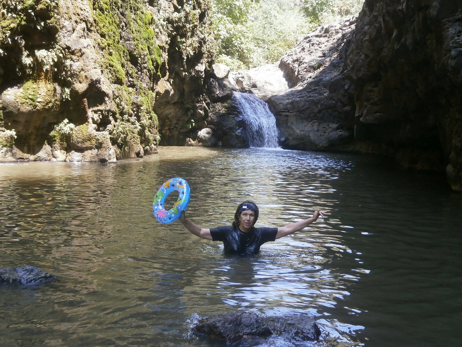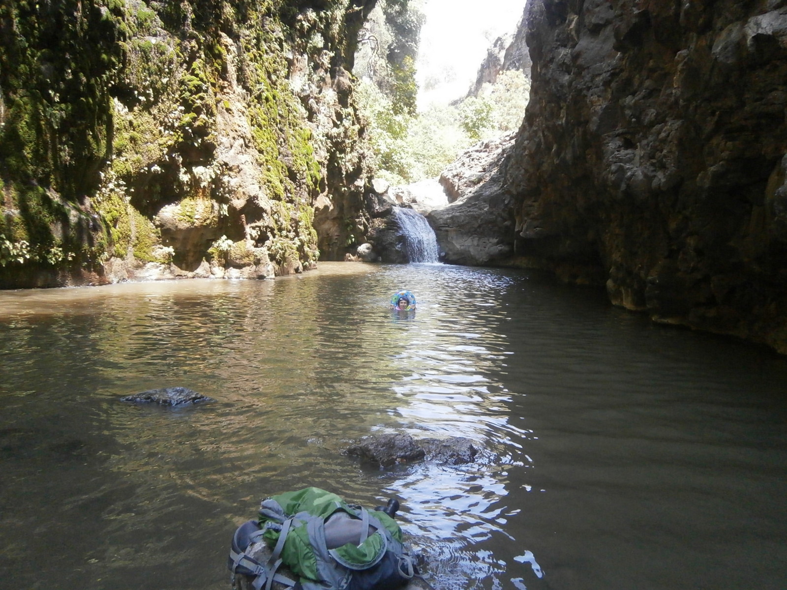 Затем прошли ещё немного, спустились по скобкам рядом с водопадом и переплыли бреху, расположенную между высоких скал и очень живописную.