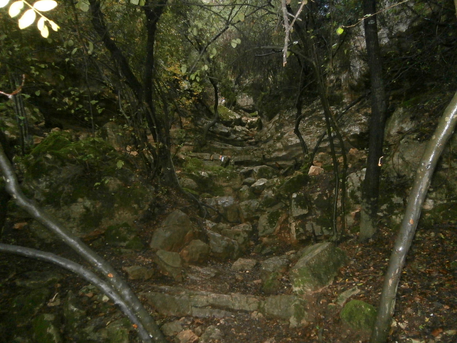 Погода тем временем продолжала стремительно портиться, и вот хлынул дождь, совсем не шуточный, сильный и долгий. Я продолжала идти, соблюдая осторожность, чтобы не упасть, и чувствовала, как вся становлюсь мокрой. Даже ветровик уже промок, не говоря уже про брюки. Временами тропа проходила среди густого леса, там было темно и мокро.