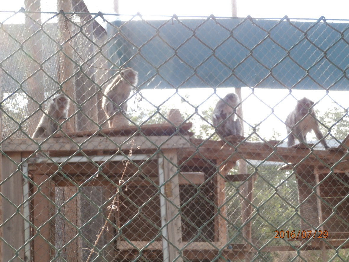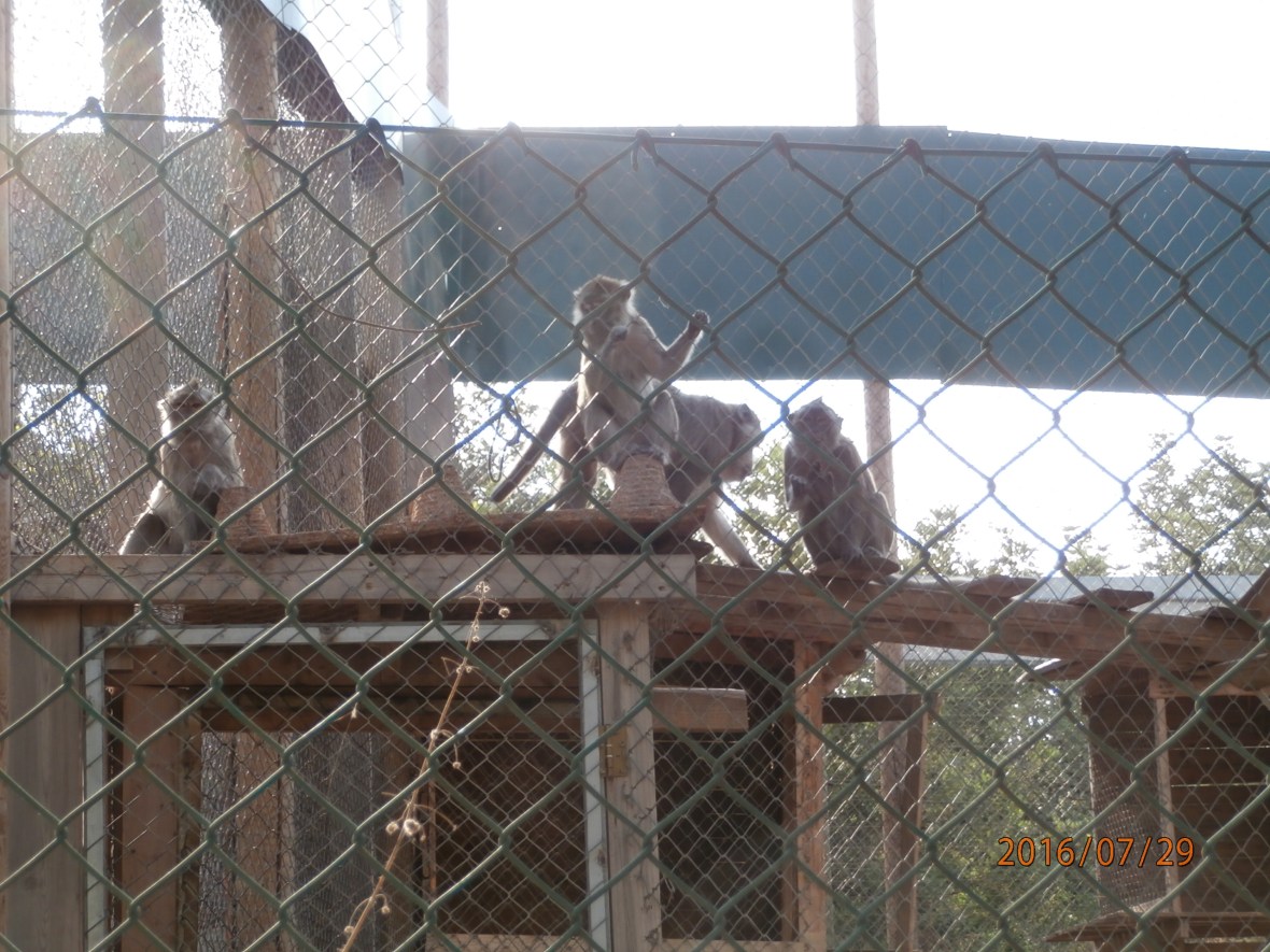 Но вскоре мы подошли ко второй аттракции — обезьянкам. Я слышала, что в этом районе есть обезьянний питомник, и это оказался именно он. Только подошли мы к нему с задней стороны. Посетителей ещё не было, и обезьянки с любопытством глазели на нас, а мы — на них.