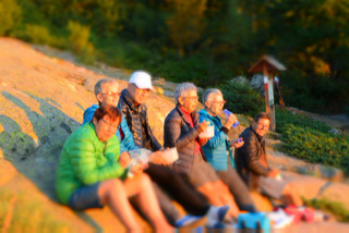 Нашли подходящее местечко, где не было сильного ветра, и только Саша искусно нарезал колбаску прозрачными ломтиками — наши знакомые «Бабушки-интеллигентки 70+» тут как тут. Точно также было и вчера — они догнали нас, когда мы резали колбасу. Вместе дружно посмеялись над таким совпадением.