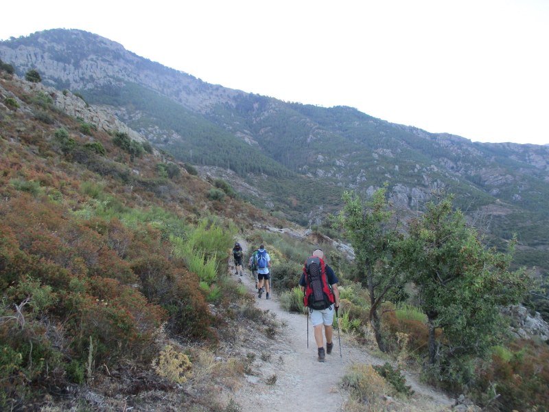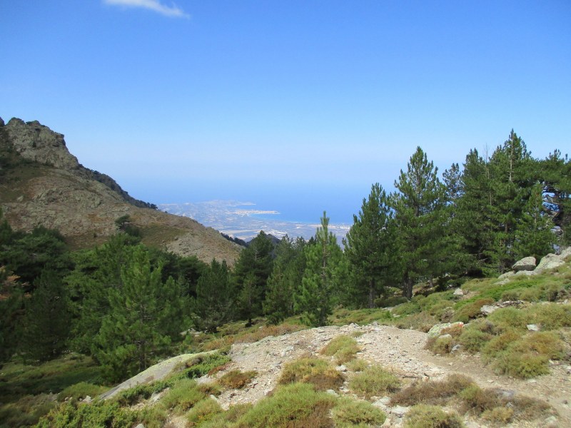 К 6 часам была полная боевая готовность, и можно было трогаться в путь. Стали спрашивать у народа, как пройти к началу трека, и молодой дружелюбный парень-француз объяснил, что нужно повернуть направо сразу после ресторана GR 20, и по узким улочкам — вперёд и вверх. Было ёще темно, мы одели фонарики и пошли…С первых же метров начался крутой набор высоты. Постепенно рассвело, и внизу мы увидели стремительно удалявшуюся от нас Калинзану.Природой начали восхищаться с первых же секунд. Сашу особенно поражали деревья небывалой толщины и высоты.Тропа была удобная (пока!), и хоть шла она всё время  вверх, сил с утра  было много, и мы хорошо продвигались.