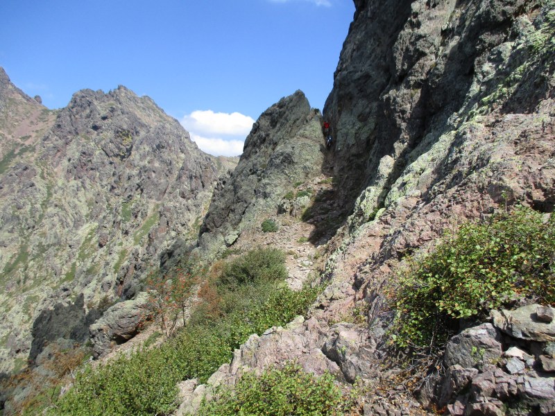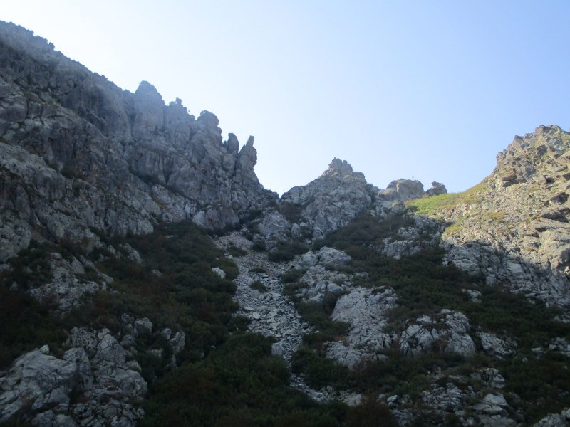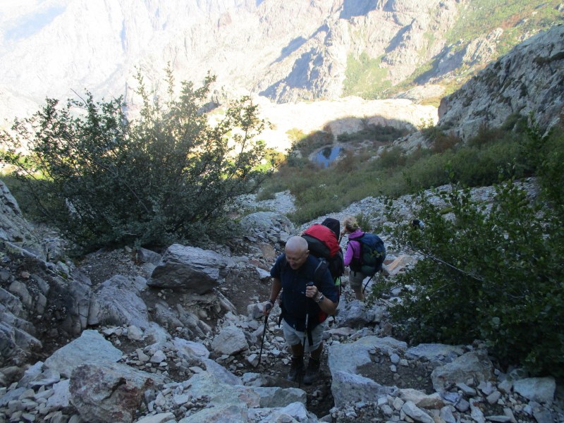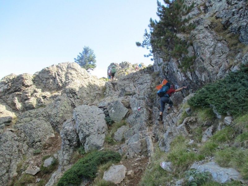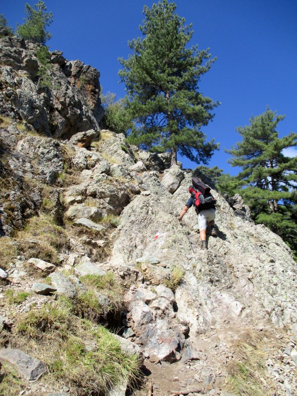 Вскоре лес закончился, и мы оказались на перевале Bocca U Saltu 1250 м. Поднялись на 975 м без особых усилий. Первый день трека, мы полны сил и решимости. Да и тропа была лёгкая, а подъём — постепенный.img_2012После перевала начались скалы, а с ними — и «легкое скалолазание», так любимое мною. Кое-где были провешены цепи. Лезть по скалам  интересно, но с тяжёлым рюкзаком это делать трудно.