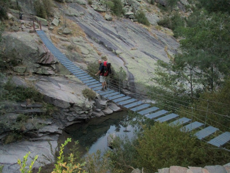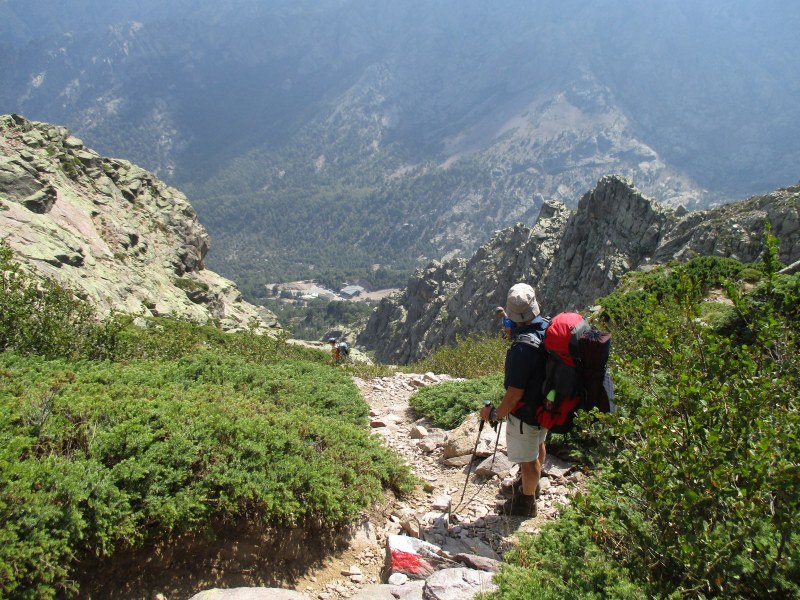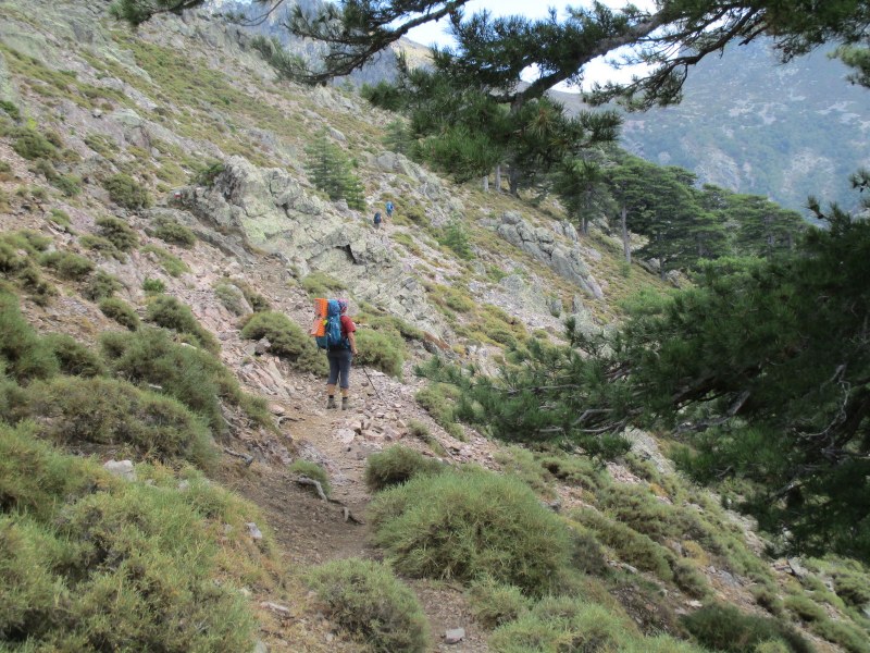 Едва ступив на тропу, мы поняли, что народу на GR 20 будет много! Человек 6-7 вышли раньше нас, их и след простыл. Нас стали догонять и перегонять. Приветствуя догонявших неизменным: «Бонжур!» (как принято во Франции), и получив в ответ: «Мерси!», мы пропускали всех желающих. Пусть себе идут. А мы никуда не торопились, берегли силы и шли своим темпом. Примерно 95% всех идущих — это молодые и спортивные ребята и девчонки. Но были и пожилые. Обратили на себя внимание три бабушки-француженки в возрасте за 70. Выглядели они так, будто ходят в горы с детсадовского возраста. Шли резво и тоже нас обогнали. Хвала им и почёт! Это — явление.
