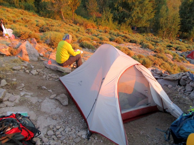 Когда мы в 14:40 пришли в рефьюж (пройдя первый этап за 8 ч 40 м вместо заявленных 6-ти с половиной, что совсем неплохо), я чувствовала крайнюю степень измождения  и просто не могла пошевелиться. Видимо, с непривычки. Но наконец можно снять рюкзак и присесть. Какое блаженство! Я сидела без движения и обозревала окрестности, а Саша в это время, как ни в чём ни бывало, устанавливал палатку, будто и не устал вовсе.Когда палатка была готова, я залезла в неё, замертво рухнула на коврик и отключилась на неопределённое время. Минут через 30 пришла в себя. Теперь можно жить. Далее начались рефьюженские будни — заказ ужина, оплата (ужин 20 Евро, 2 человека в своей палатке — 14 Евро), очередь в душ. Народу на этом рефьюже было очень много, а душ всего один. Долго ждали свою очередь, чтобы окатиться ледяной водицей. Но до ужина, который начинался здесь в 19:00, успели. На ужин подавали суп, блюдо из бобовых (довольно вкусное) и шоколадный пудинг. По моему мнению — еда сносная, но очень дорогая для такого набора блюд. Саше не понравилась ни еда ни, тем более, цена. Не давали мяса и вина. А это, как считал Саня, абсолютно неприемлемо после тех нагрузок, которые мы испытываем. Решили, что завтра будем как-то менять питание.