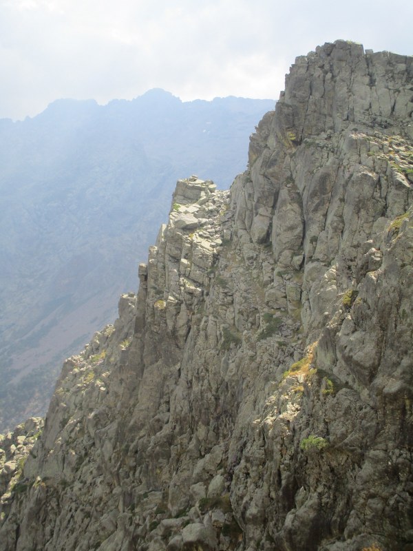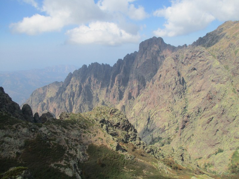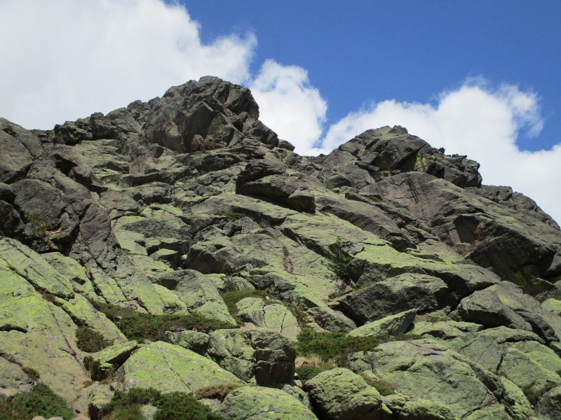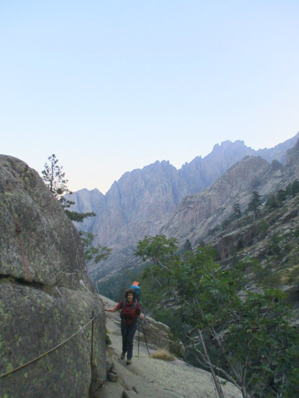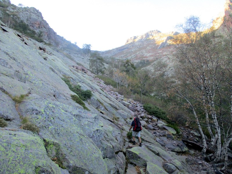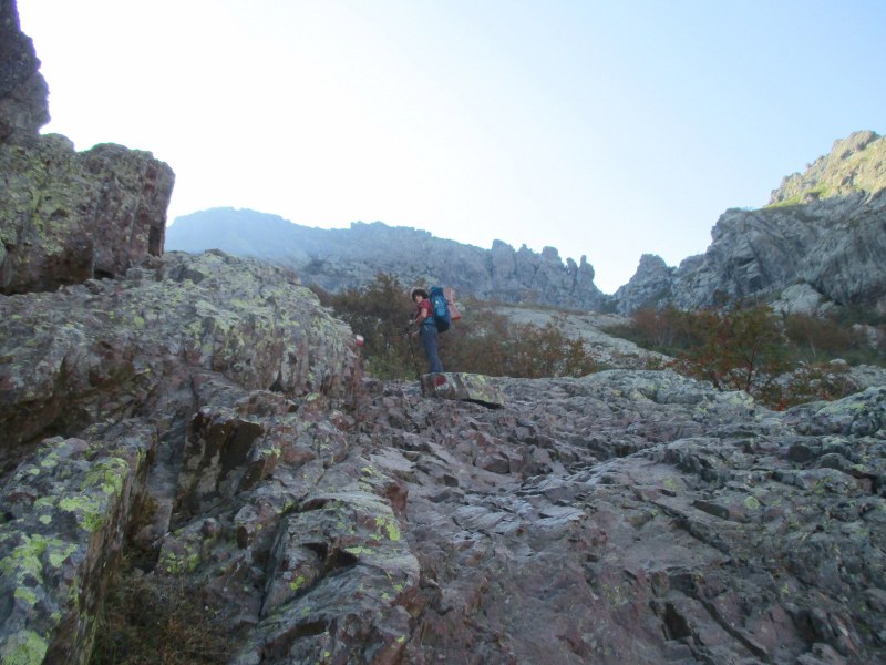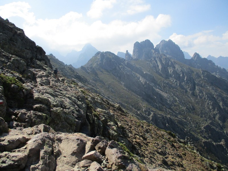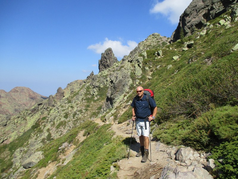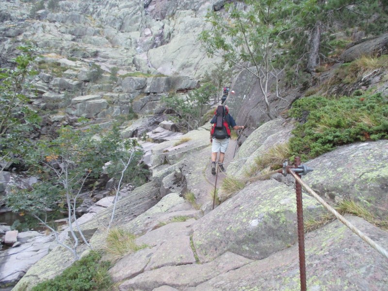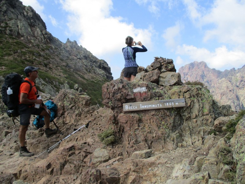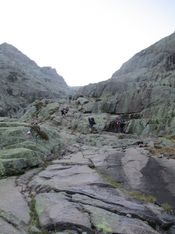 Сегодня вышли в 6:45. Сборы в рефьюже были посложнее, чем вчера в кемпинге. Удобств меньше и они далеко от палатки. Возились дольше. Но кофе попить и бутерброд с колбаской съесть — успели.  Уже было светло, поэтому шли и любовались на берёзки, совсем, как российские.Разумеется, сразу начался подъём. Сначала по лёгким болдерам, затем болдеры стали позаковыристее. Иногда подъём проходил по почти отвесным стенкам, так называемый скрэмблинг, или карабкание, или лёгкое скалолазание. Скрэмблинг и болдеринг — это то, чем мы сегодня занимались целый день. Скалы, скалы и скалы! Начался настоящий GR 20. Вчерашняя тропа вспоминалась, как подарок, сделанный по ошибке.  Маршрут GR20 известный и популярный в Европе, поэтому людей на тропе много, и страны они представляют разные, но больше всего  французов.  Те, кто шёл из Калинзаны на север, нам уже примелькались. Мы периодически кого-то догоняли, кто-то догонял нас, так и шли параллельно.  Были здесь и одиночки, и пары, и небольшие группы. С некоторыми из них мы общались — Римке с подругой Розаликой из Голландии, весёлая пара Изабель с другом из Бельгии, Хуго со старшим товарищем из Канады и, конечно, наш Томер. Чтобы было веселее идти, некоторым группкам мы придумали имена. Были у нас и «Бабушки-интеллигентки» (вечерами почитывали книжки), и «Аидише растамены» (2 растамена-блондина и один с обычной причёской), и «Суперлёгкий рюкзак или Борода» (так мы прозвали канадцев), и «Самурай со своей гейшей» (парочка японцев, он в камуфляжной одежде, а на поверку оказались китайцами). Была на маршруте и такая группа: 4 женщины-пенсионерки, за которыми присматривало двое мужчин помоложе, причём 3-е из 4-х женщин  поразительно напоминали старушку Шапокляк из любимого мультфильма. Понятно, что они получили имя: «Группа старушек Шапокляк».