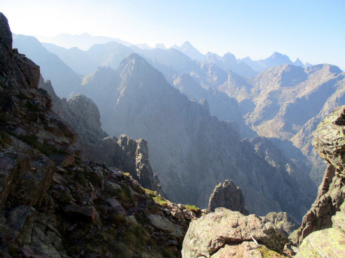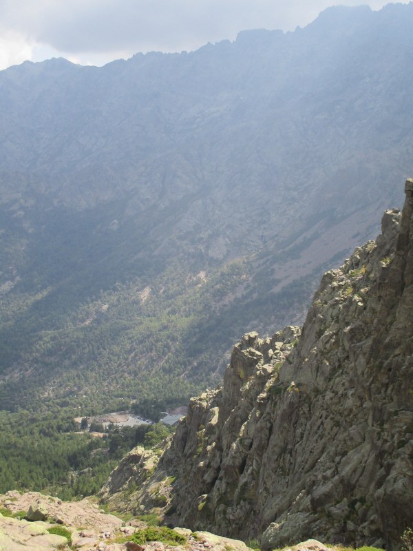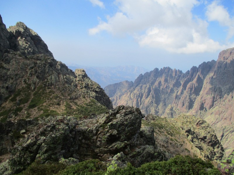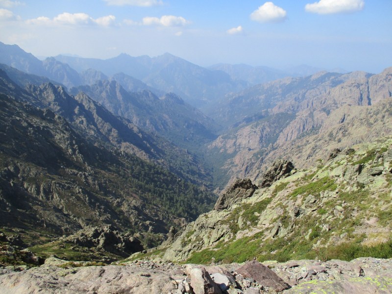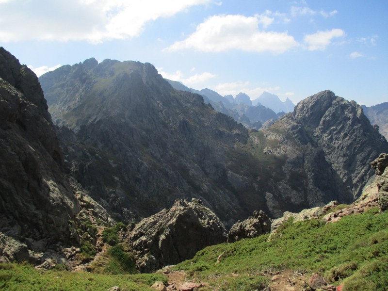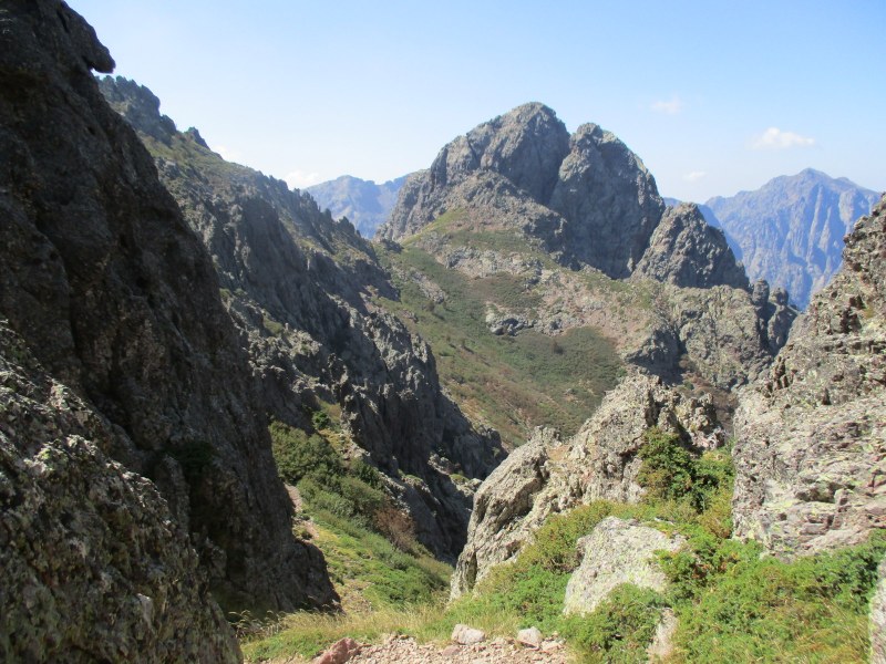 В таком месте невозможно было не остановиться, и мы все вместе сидели и отдыхали, смеясь и переговариваясь, и наслаждаясь умопомрачительными видами и шикарной погодой. После перевала начался спуск по скалам, где мы обогнали  «Старушек Шапокляк». А вскоре опять был подъём, на этот раз небольшой, и вот мы уже на следующем перевале Bocca Stagnu (2003 м). Отсюда начинается спуск, отсюда уже видна цивилизация — горнолыжный курорт Аско. Нам — туда, и, кажется, что цель совсем близко. Ан нет. Опять убийственнейший спуск, скальный и длинный, 600 м по вертикали. Ещё хуже, чем вчера, более трудный технически, а потому более изматывающий. Спускались  целых 3,5 часа! Но зато целые и невредимые прибыли в рефьюж Asco StagnuОттуда мы идём, по этим, покрытым мхом, камням…
