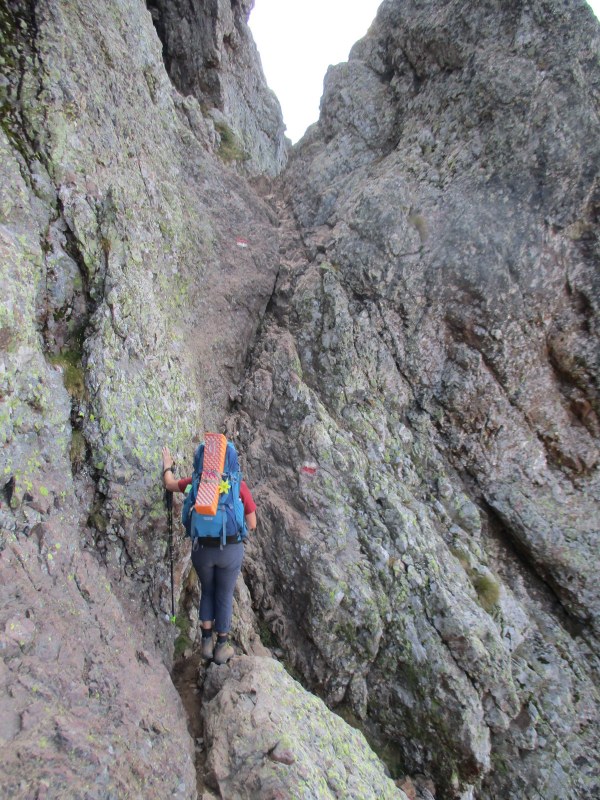 На самом деле идти по таким скалам намного интереснее, чем по тропе. Поэтому столько людей любят этот трек и хотят его пройти.Второй этап был тяжёлым, и дался мне нелегко, чего уж там скрывать. Два раза мы отдыхали по полчаса, один раз перекусывали. Причём только Саша начал резать заветную колбаску, как на тропе мимо нас бодрой поступью прошагали героические «Бабушки-интеллигентки», приветствуя неизменным «Бонжур!»