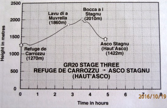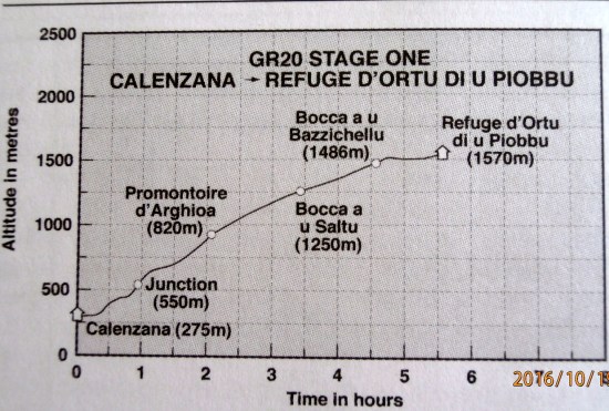 Информация о каждом этапе (перепад высот и протяженность в км) в разных источниках отличается, и иногда значительно. Данные о перепаде высот я буду приводить из путеводителя TopoGuides, а данные о протяжённости — из отчёта одного «крутого» треккера из Дании, прошедшего  GR 20 за 11 дней (http://corsica.forhikers.com/forum/p/24925). Рельеф каждого этапа взят из путеводителя Давида Аврама.