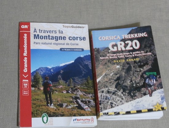 GR 20, маршрут, протяжённостью примерно 180 км,  пересекающий остров Корсика с севера-запада на юго-восток, обычно делят на 16 этапов. Этапы привязаны к местам ночёвок (рефьюжи, кемпинги), но деление может отличаться от одного путеводителя к другому. В прошлом году я привезла с Корсики карты, охватывающие весь GR 20:И две книжки-путеводителя:Путеводитель  издательства  TopoGuides (слева) оказался более удачным, и именно им мы и руководствовались, и именно такой путеводитель мы видели у большинства треккеров на маршруте. В нём, кроме невозможного для нашего понимания текста на французском языке, содержалось много ценнейшей информации, понять которую мы были в состоянии, как то: точные карты, географические названия, суммарные перепады высот по этапам и их продолжительность в часах. Ни карты, ни путеводитель мы с собой не брали, поскольку это дополнительный вес, и, честно сказать, правильно сделали. Хорошо, что они есть дома (я в них постоянно заглядываю), но на треке они не нужны. Заблудиться там невозможно, трек размечен великолепно, и красно-белая разметка, подкреплённая многочисленными руджумами, постоянно в поле зрения. Идти в поход совсем без карт для меня было очень непривычно и некомфортно, поэтому я хотя бы перефотографировала карты из путеводителя в телефон. Кроме этого мы выписали нужную информацию по каждому этапу, и вся она уместилась на одном листочке. Вечерами мы просматривали маршрут следующего дня. Правда диаграммы рельефа у нас не было, лишь общий перепад высот, поэтому нас всегда ждали сюрпризы.