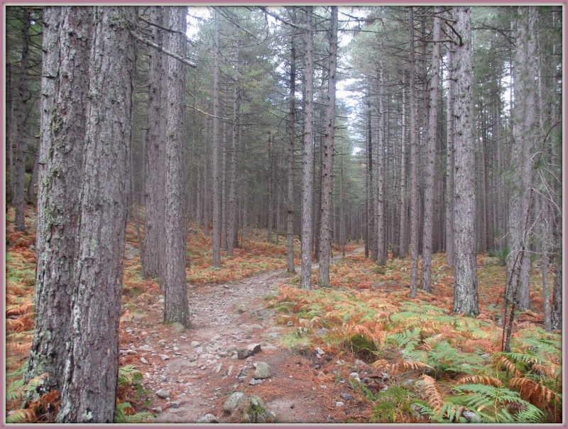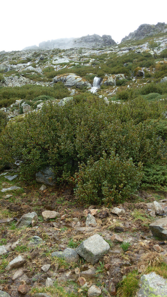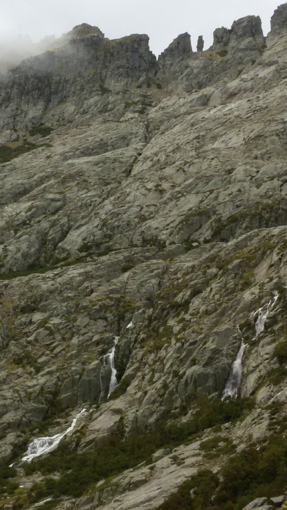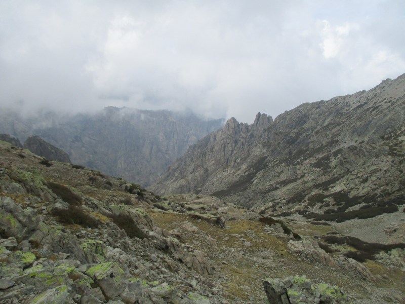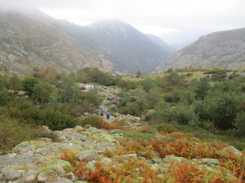 На этом этапе существует 2 возможных пути. Верхняя тропа (GR 20 Variante) и основная. Верхняя тропа не спускается сразу вниз, и, идя по ней, можно любоваться на окрестности с высоты. Могу только рисовать себе в воображении, какая там должно быть красота! В нашем случае вопрос, по какой тропе идти, даже не обсуждался. Красоты всё равно не видны, поскольку туман, да и делаем мы GR 20 впервые, поэтому решили, что всегда идём по основной тропе.