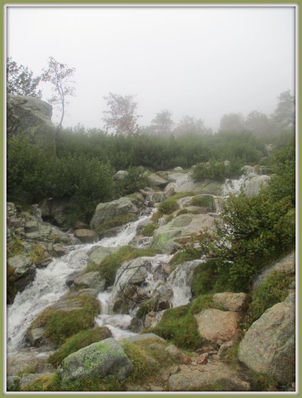 Подъём закончился, и теперь нам предстояло идти только вниз и вниз. Мы знали, что спуск будет очень длинный, 1221 м по вертикали. А тем временем не было никакого намёка на то, что дождь утихнет, наоборот, он только усиливался, и немыслимое количество воды низвергалось с неба. Мы начали спускаться. Шли очень осторожно, продумывая каждый шаг. Дождь лил, но туман рассеялся, и видимость была, и на спуске нам открылась потрясающая картина. Далеко внизу мы увидели широкую долину, с трёх сторон была окруженную горами. В центре, на самом верху, находились мы, а справа и слева от нас по ущельям, прорезавшим окружающие горы, текли бурные потоки, иногда ниспадающие водопадами. И таких ущелий, оживших и наполнившихся водой, было очень много на склонах гор. От этой картины невозможно было оторвать глаз! Любуясь на водопады, мы осторожно спускались по склону, а дождь с грозой всё не прекращался, и молнии пугали нас даже больше, чем дождь, ведь мы находились на открытом месте. В какой-то момент, переключив внимание с водопадов на нашу тропу, я вдруг обнаружила, что она всего за несколько минут коренным образом преобразилась. Со всех сторон по склону стекали ручейки, и буквально на глазах, за считанные секунды, они становились всё полноводнее и полноводнее (эта картина до сих пор стоит перед глазами). Ручейки впадали один в другой и превращались в ручьи, а затем — в речки, и кое-где эти уже «речки» ниспадали водопадами. И всё это происходило не где-то там далеко в горах справа и слева от нас, а прямо здесь, на склоне, по которому мы шли. Помнится, мне тогда подумалось: «Wow! Что делается-то!»