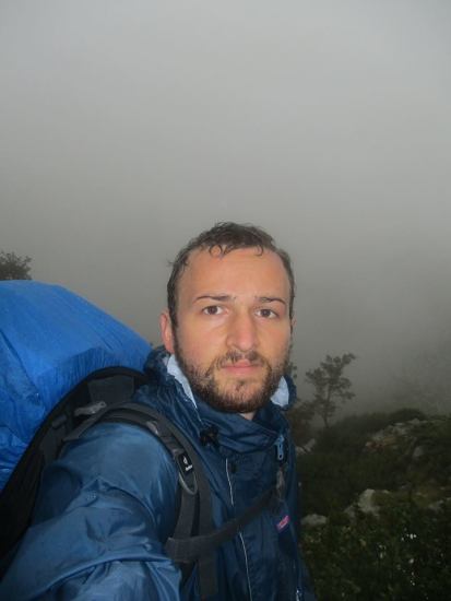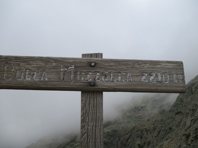 Часа через 3 с половиной мы наконец-то докарабкались до самой высокой точки сегодняшнего этапа Punta Muratello (2064 м). Здесь дул сильнейший ветер, и было страшно холодно. Дождь продолжал хлестать со всей силой, в тёмном небе сверкали молнии и раздавались раскаты грома, всё вокруг было окутано туманом, и ничего далее метра-двух не было видно. Короче, та ещё ситуация…