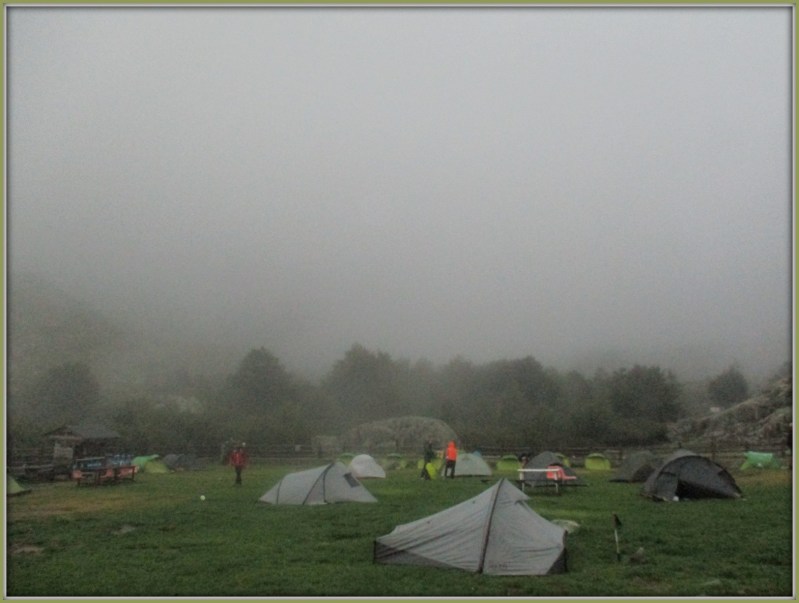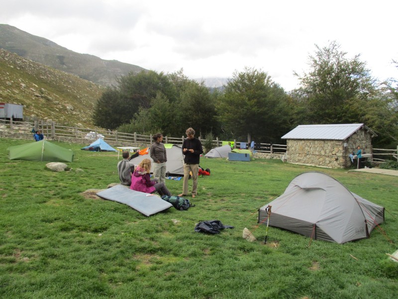 Рефьюж l’Onda — приятный, расположен в красивом месте среди гор. Мы его прозвали «травяной рефьюж», поскольку он имеет как бы 2 части: загон для палаток с пышной и мягкой зелёной травой (травка — просто прелесть!) и строение, где расположены нары (ну ладно — двухъярусные кровати). Там обитает совсем другая публика. А в загоне — все вместе, все в палатках. Интересный народ, эти треккеры, и интересно за ними наблюдать. К этому моменту определилась компания людей, с которыми мы вместе прошли уже 8 этапов, и с которыми дружелюбно общались — Томер, Римке с Розалике, канадцы и весёлая пара из Бельгии (Изабель и её друг). Все они уже были здесь и отдыхали на траве.