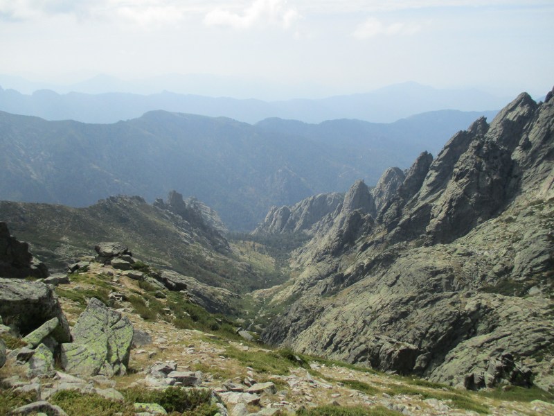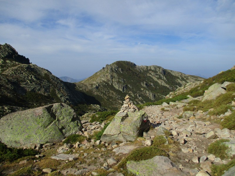 Здесь нас догнал симпатичный парень, у которого на груди была подвешена карта, и мы поинтересовались у него, далеко ли до рефьюжа, и сколько нам осталось мучиться наслаждаться, карабкаясь по таким замечательным каменистым тропкам. Он посмотрел в свою карту и обрадовал нас, сказав, что совсем скоро будет перевал, а за ним — спуск. Что такое спуск в корсиканских горах мы уже знаем. Но парень заверил нас, что спуск будет лёгкий (так и сазал — «изи») и короткий, всего 2 км. Приободрившись мы пошли полезли дальше.