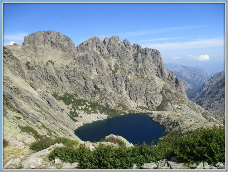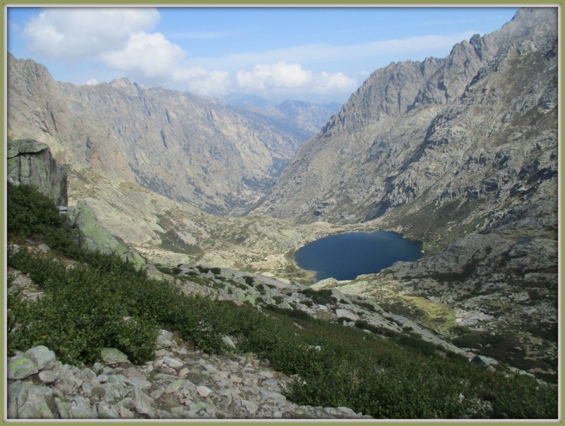 Сверху кажется, что эти два озера почти на одной высоте, но я-то знаю, что это не так, и расстояние между ними 220 метров по вертикали. На этих озёрах я была в прошлом году, когда путешествовала по Корсике. Тогда, 31-го мая, возле верхнего озера лежал снег. Помню, я видела людей, идущих по скалам далеко вверху. А теперь я сама здесь иду и любуюсь озёрами сверху.