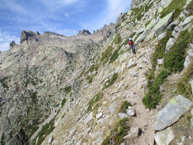 Отдыхнув, мы двинулись дальше, оптимистично думая, что рефьюж уже недалеко (напомню, что мы путешествовали по GR 20 без карт и без GPS). Но тропа говорила нам иное… Маршрут продолжал идти вокруг озёр, его направление просматривалось на сотни метров вперед, и вскоре стало ясно, что нам предстоит подниматься на перевал. По-прежнему, никакой нормальной тропы не было. Мы шли, выискивая удобный путь среди камней, а на каком-то этапе камни вообще сменились огромными болдерами, и начался жёсткий болдеринг, вынувший из меня все оставшиеся силы.