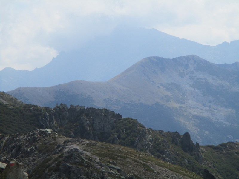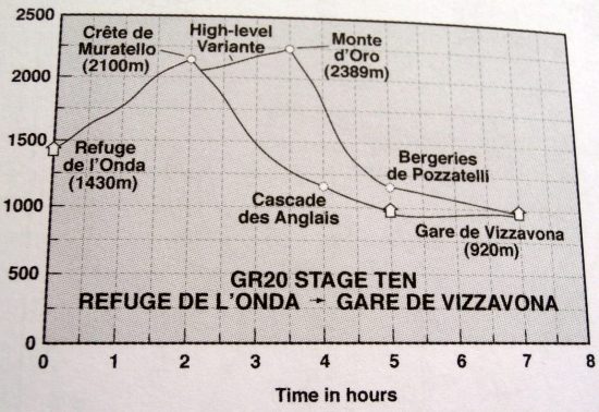 ***От Punta Muratello можно было повернуть налево и дойти до Виззавоны по тропе GR 20 Variante, проходящей в непосредственной близости от вершины Monte d’Oro (2389 м), набрав дополнительно 300 м в высоту. Можно было взойти и на саму вершину Monte d’Oro. Можно было, но не в такую погоду. Но даже и в хорошую погоду мы бы туда не пошли, поскольку решили пройти GR 20 по основному пути. (Обязательно сходим в поход по маршруту Виззавона — Monte d’Oro — Виззавона в одно из следующих посещений Корсики.)