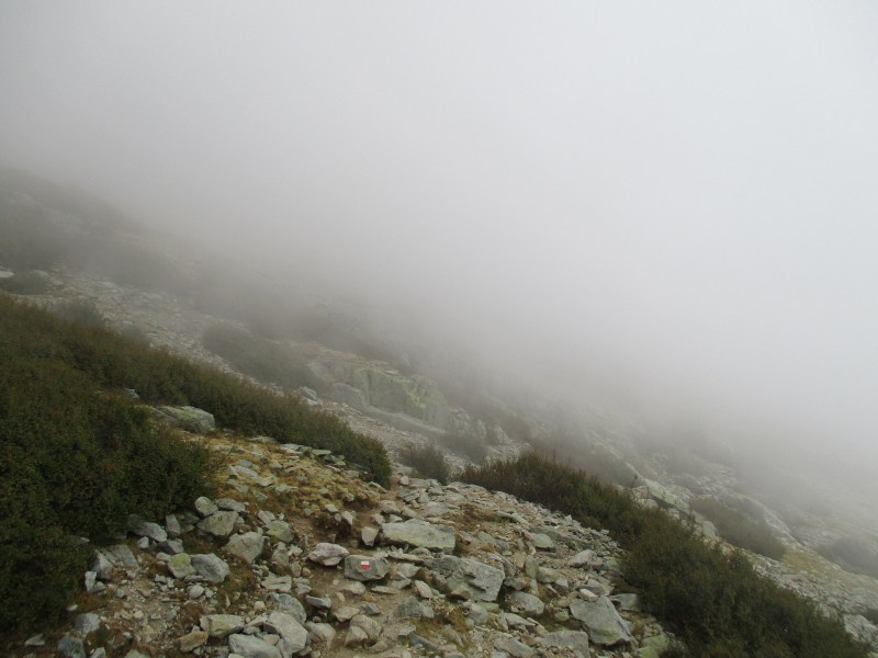 Сразу начался крутой спуск, но не по скалам, а просто по каменистой тропе (едва угадывавшейся в тумане). У нас уже большой опыт спуска по таким тропам :-). И хорошо, что спуск с утра, когда в ногах ещё много сил.