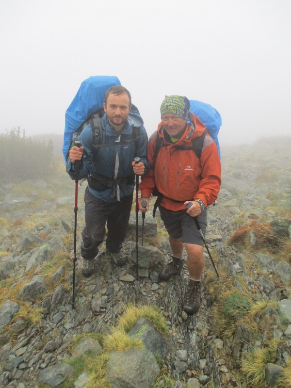 Собирались в сырости, поёживаясь от холода (высота рефьюжа 1842 м). Рюкзаки сегодня тяжелее обычного на 1.5-2 кг, в них замоченные ночным дождём вещи, сушившиеся на верёвке, а у Саши ещё и мокрая палатка.