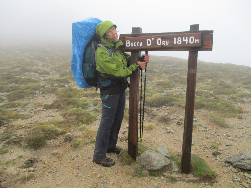 Наконец, часа через 2 с половиной пришли на перевал и увидели вывеску: Bocca D’Oru (1840 м). Это означало, что от перевала Bocca di Verde мы поднялись на целых 530 метров. Немало.