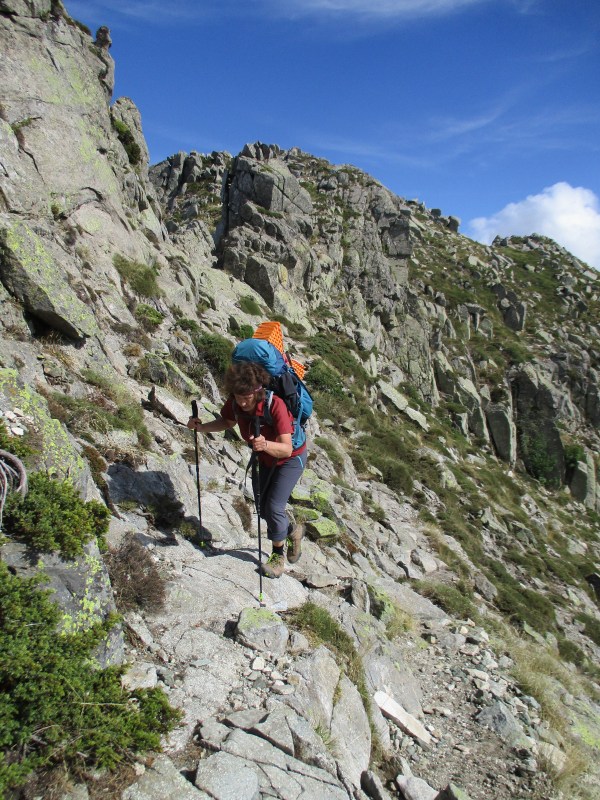Вышли с рефьюжа последними, в 9:10. Ну да ничего, путеводитель обещал подъём всего на 160 метров,  спуск — на 963 м и время на маршруте всего 5 часов. Надеялись, что наконец-то  будет лёгкий день. Но какой там!!! На GR 20 нет лёгких дней. Их просто нет.  Обещанный подъём на 160 м мне показался всеми 300-400 м. Но на самом деле я уже не могла оценить это адекватно. 16-й день трека давал о себе знать. Усталость чувствовалась, она накопилась, и избавиться от неё можно было только , отдохнув день-два безо всякого движения. Но у нас такой возможности в данный момент нету-ти. Нужно идти вперёд, в Конку.