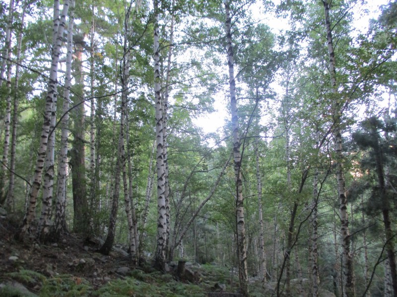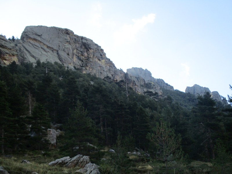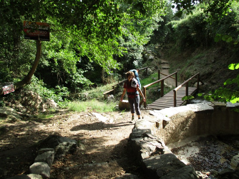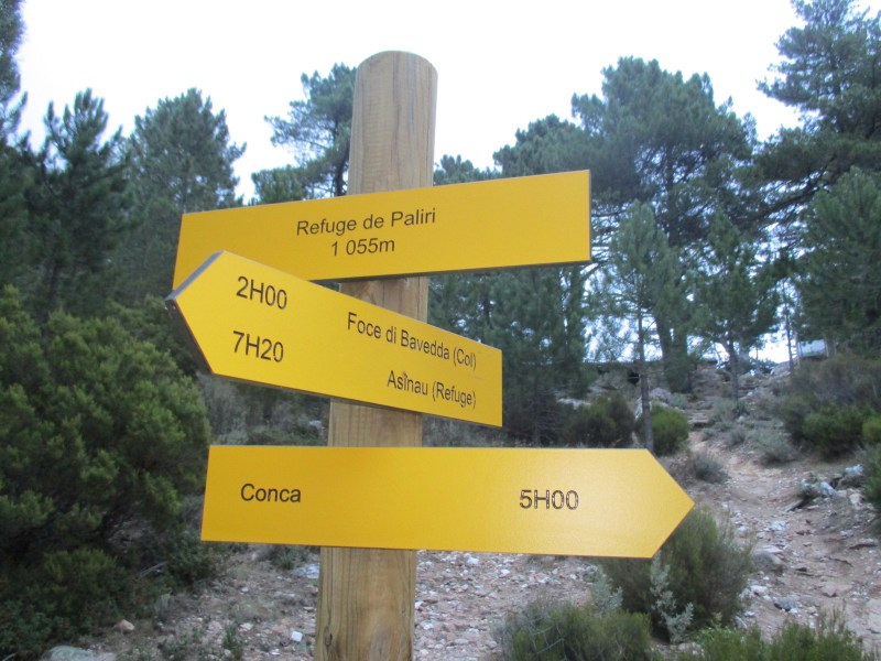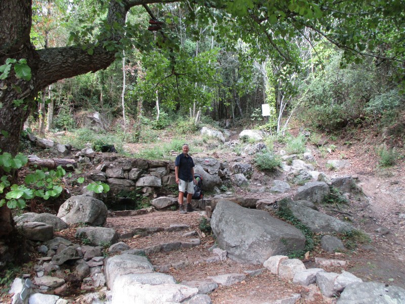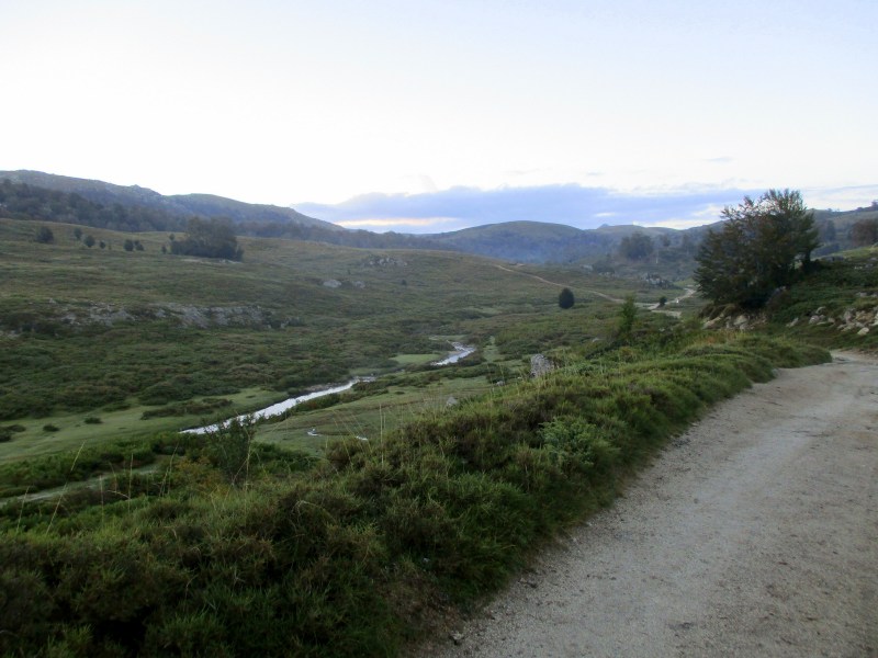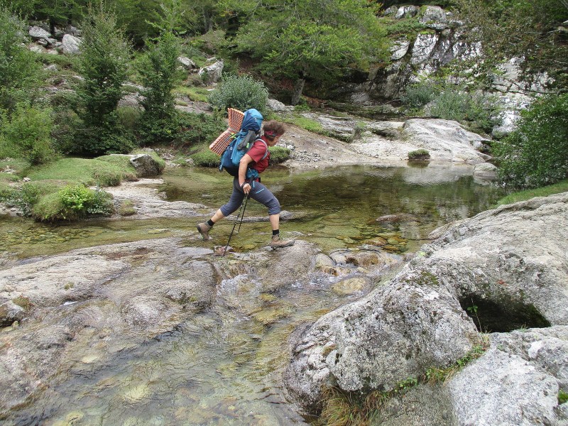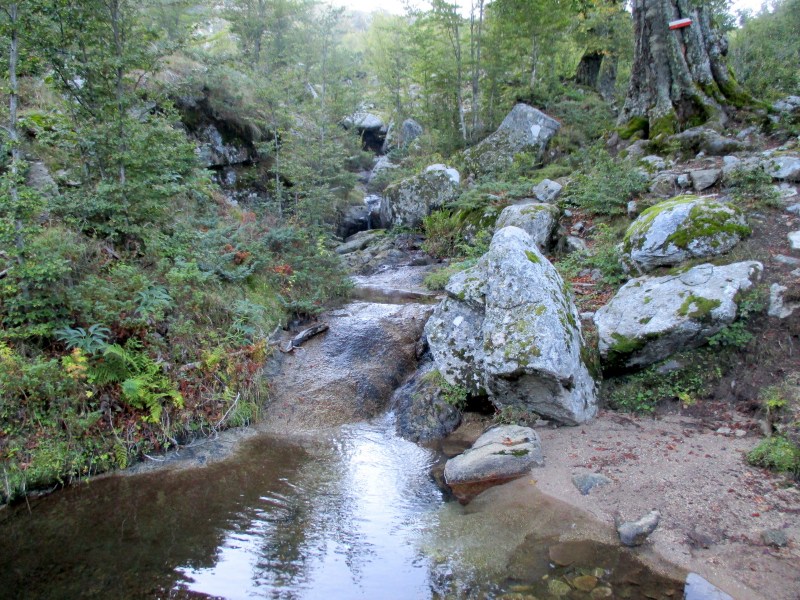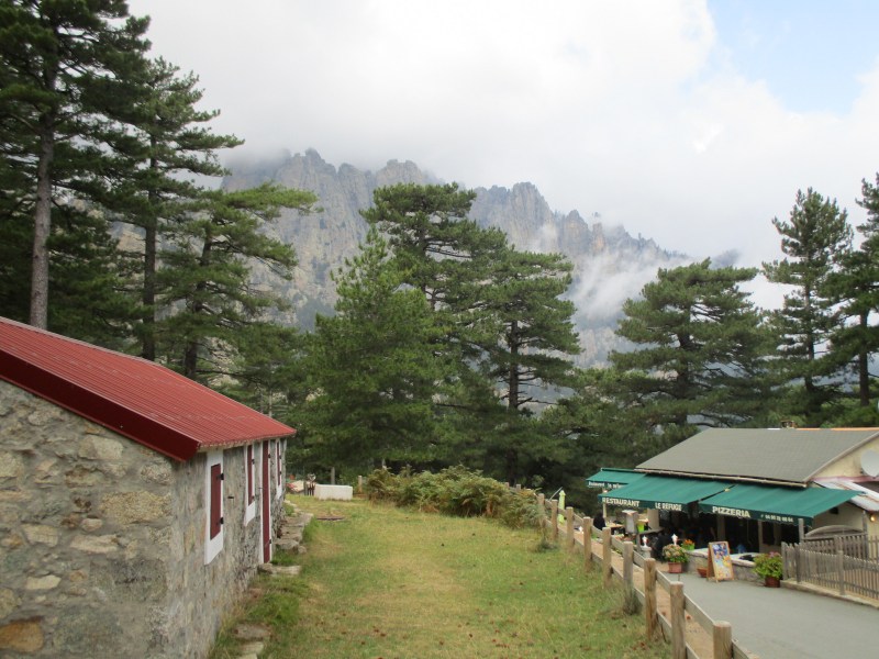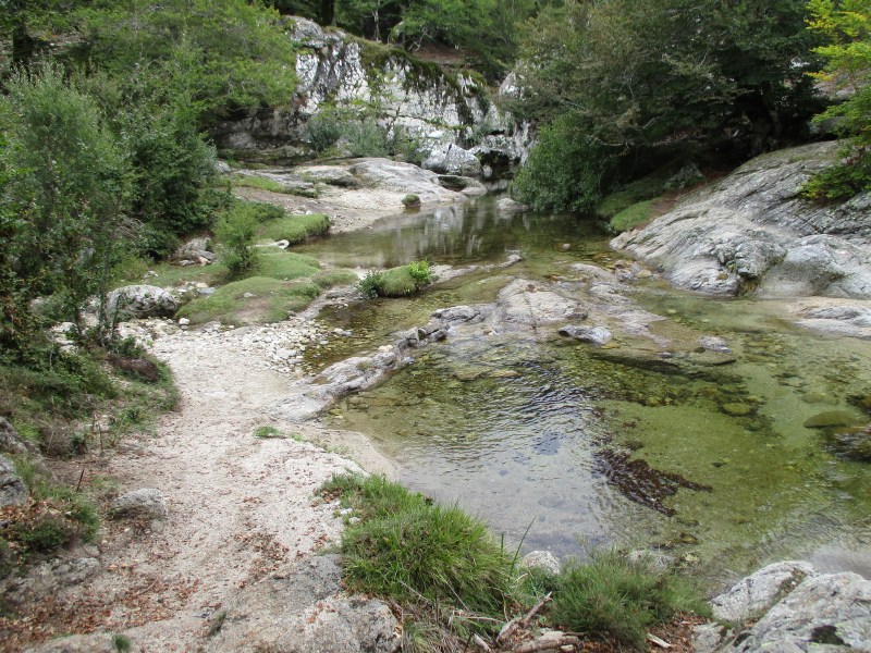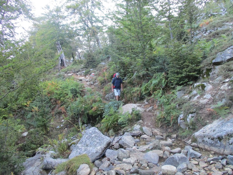 Спустились в долину, перешли через речушку, попали в приятный лес  и пошли по нормальной  тропе среди леса. Миновали развилку, где можно было свернуть на  «альпийский вариант GR 20» — типа снова полазить по скалам. Но мы сворачивать не стали и пошли по общепринятому маршруту. Впоследствии в разговорах с треккерами выяснилось, что большинство из них шли по альпийскому варианту и остались им очень довольны. Маршрут этот красивый и аттрактивный (кое-где есть даже цепи), там  немного добавляется  подъём  и спуск, но зато он заметно короче общепринятого, и, видимо, мы зря по нему не пошли.