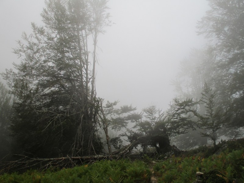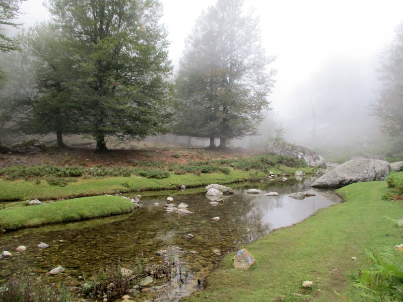 Перешли, перепрыгивая с камушка на камешек, милейшую речку с водопадом, миновали  ферму Bergeries de Bassetta, где можно остановиться на ночлег. Прошли мимо источника и уголка для пикников, мимо окутанной туманом загадочной часовни San Petru и зашли в не менее загадочный лес с расбросанными среди деревьев огромными валунами, поросшими ярко зелёным мхом.