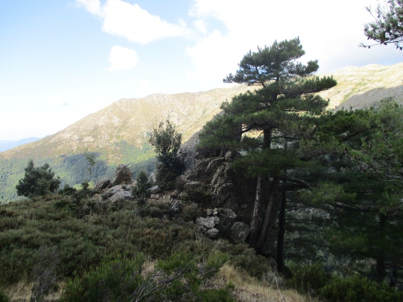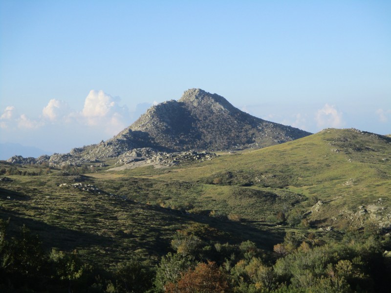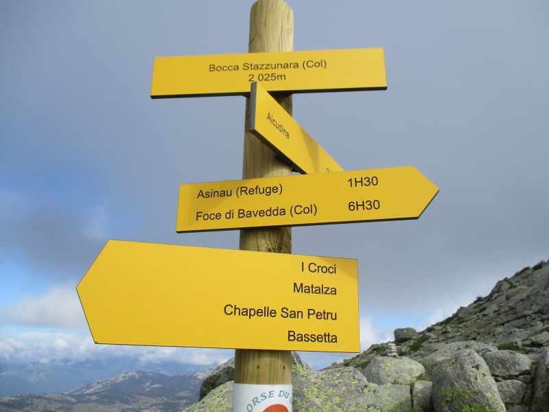От перевала Stazzunara мы могли бы сбегать на вершину Monte Alcudina (2134 м) и тем самым покорить хоть одну корсиканскую гору. Но мы этого, конечно, не сделали, поскольку: 1) в тот момент мы не знали, что рядом есть вершина,  2) не знали, что вершина так близко — всего 20 минут ходьбы, если верить вывеске, а вывеской мы в тот момент не поинтересовались, думали только о спуске, и чтобы не начался дождь. Да и знай всё это, вряд ли бы пошли, в основном из-за погоды, хотя…