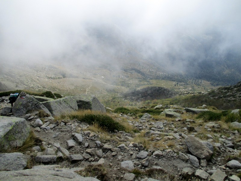 А погода начала портиться. Небо затянуло облаками, но обещанного дождя пока не было. С перевала в просвете облаков мы увидели наш рефьюж.Спуск  действительно был убийственный — длинный, скальный и очень крутой. 500 метров по вертикали. Сейчас, изучив карты и диаграммы, могу с уверенностью сказать, что это был самый крутой спуск на всём GR 20.