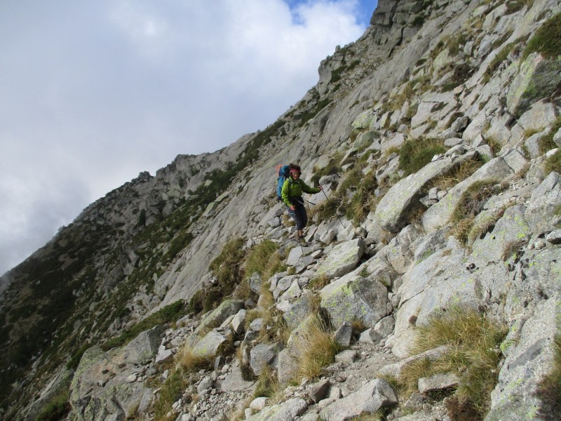 Сразу после перевала начался неслабый траверс по скалам. Ножку влево, ножку вправо, немного вверх, немного вниз. Так, соблюдая максимальную осторожность, мы продвигались вдоль хребта скальной горы, где с двух сторон был предельно крутой склон, а кое-где просто обрыв. С одной стороны  хребта были отвесные голые скалы, а с другой — склон, поросший лесом. Красота вокруг невероятная, и я не устану это повторять, и какое счастье, что мы всё это видим!