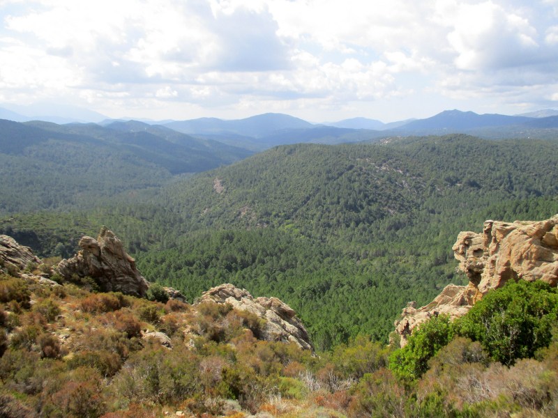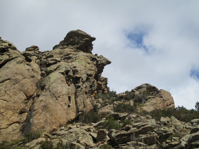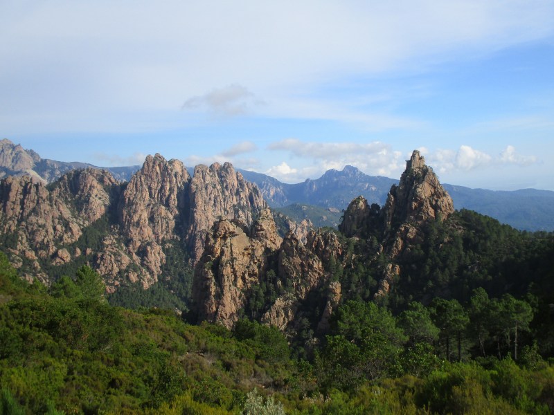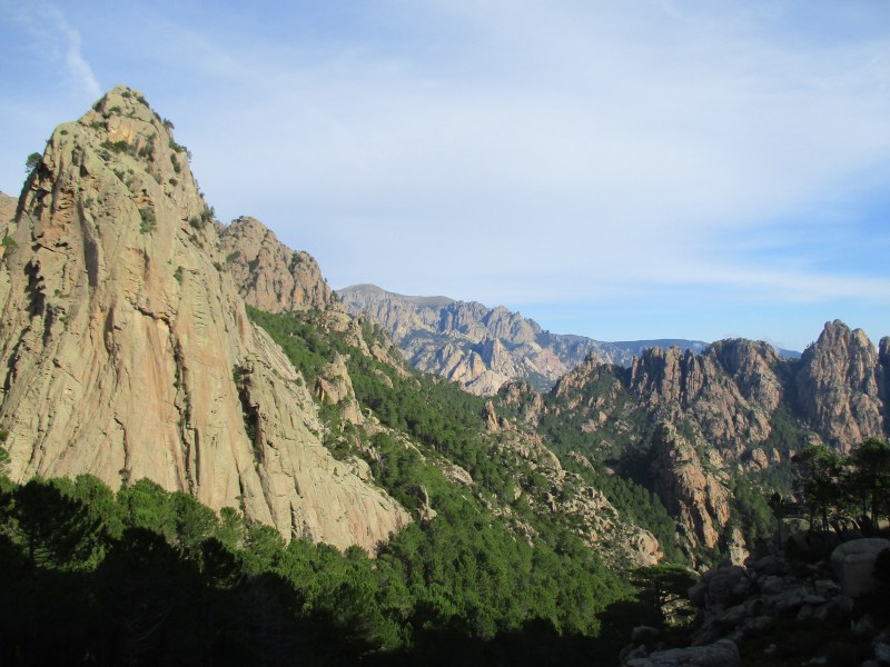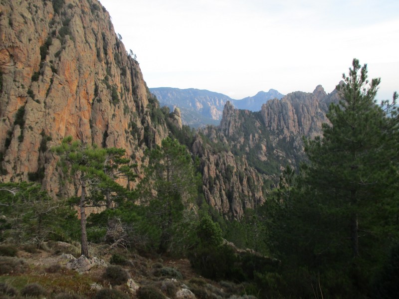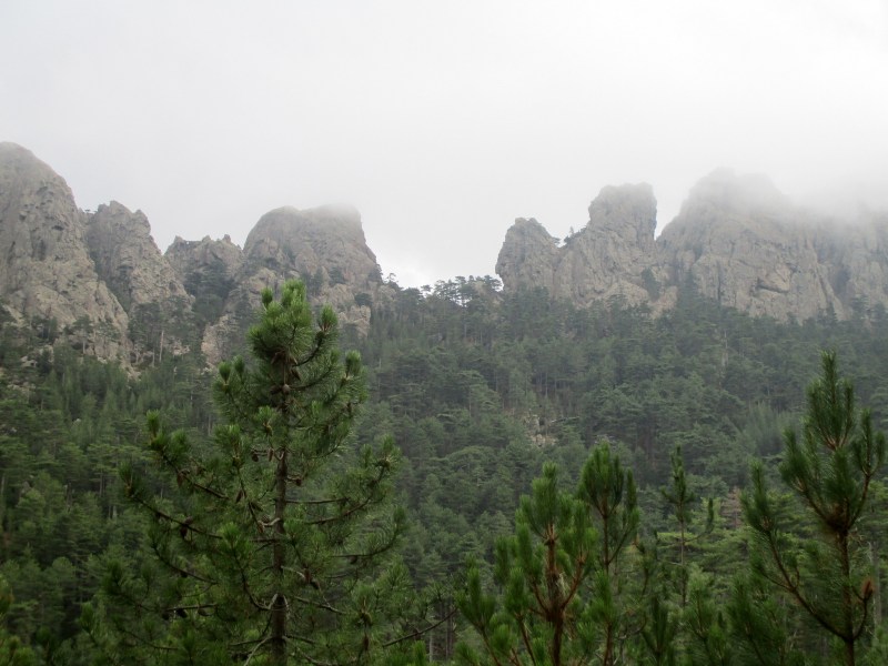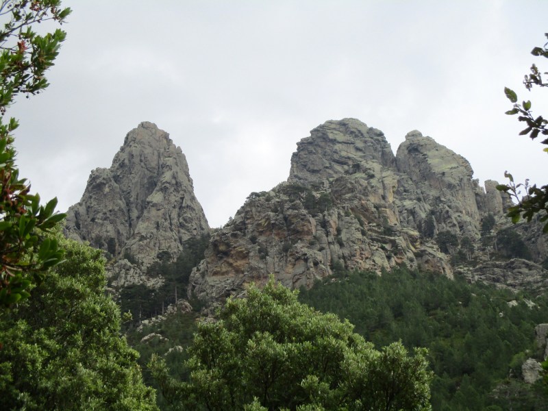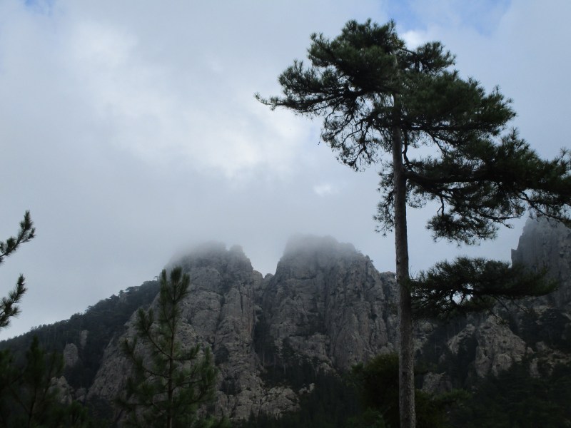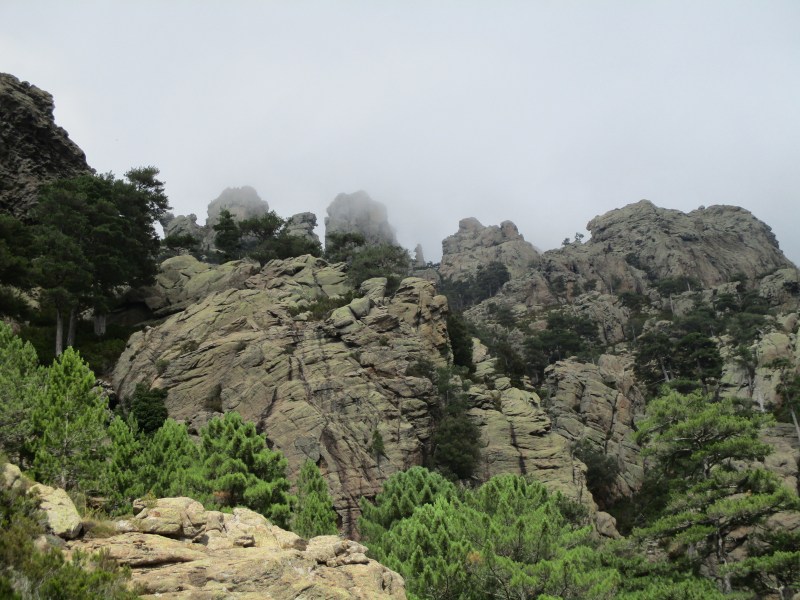 На перевале (Bocca di u Sordu, 1040 м) отдохнули в окружении скал фантастических форм и глубоких загадочных ущелий, обрамлённых отвесными скалами-стенками.