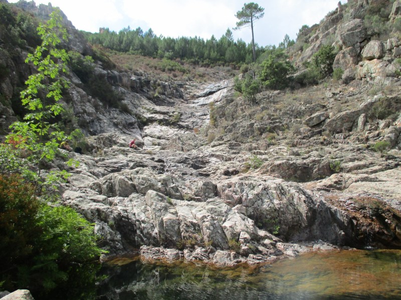 Мы спустились в ущелье, к ручейку, а там неожиданно для нас  — рай земной. Течёт маленький водопадик, а под ним несколько довольно больших бассейнов с прозрачной и чистой водой. Возле одного из них — группа пожилых французов с воображулистой красоткой-треккершей, а чуть выше -Том  и его подружка, обогнавшие нас по дороге. Все наслаждаются и кайфуют.