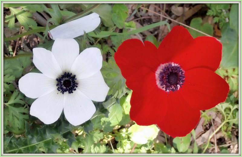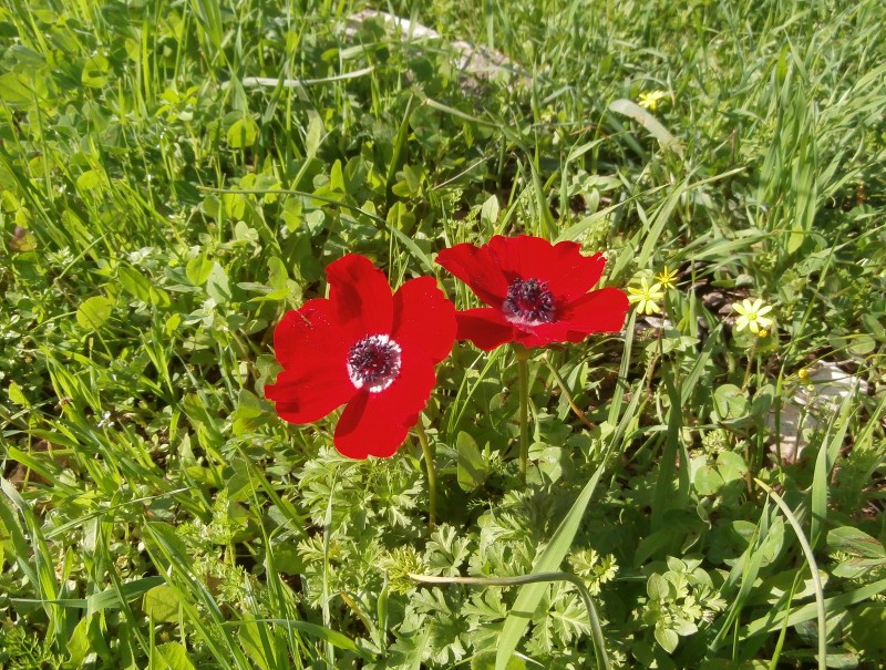 Справа и слева — всюду были поляны с цветущими аннемонами (каланиёт). Конечно, это не «Даром адом» (Красный Юг, северный Негев), где бескрайние поля покрыты ковром красных цветов, но всё равно, очень, очень красиво.
