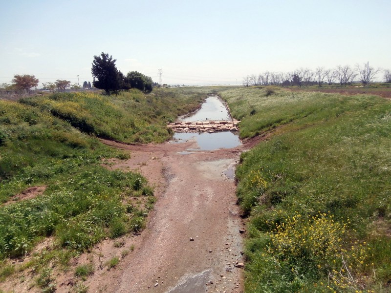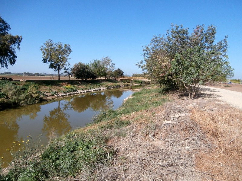 Маршрут полностью открытый, и солнце светит прямо в лицо. Идти, прямо скажем, несладко. Я очень обрадовалась, увидев рощицу, а в ней — скамеечки, заботливо поставленные в тени деревьев. Этот симпатичный уголок отдыха расположен в месте впадения маленького ручейка Бахан в нахаль Александр.
