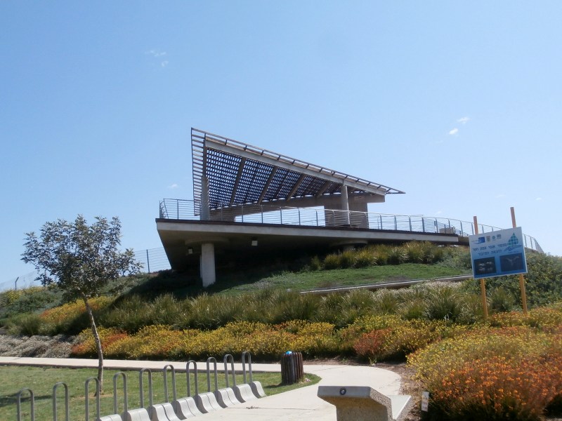 Вскоре вдали показалось большое и сначала непонятное мне сооружение. Подошла поближе — а это с размахом построенный балкон для наблюдения за птицами, которые предположительно должны бы обосноваться на искусственном озере-водохранилище, собирающем дождевую воду. Как гласит вывеска, озеро называется «Маагар Мишмар А-Шарон»