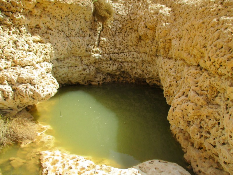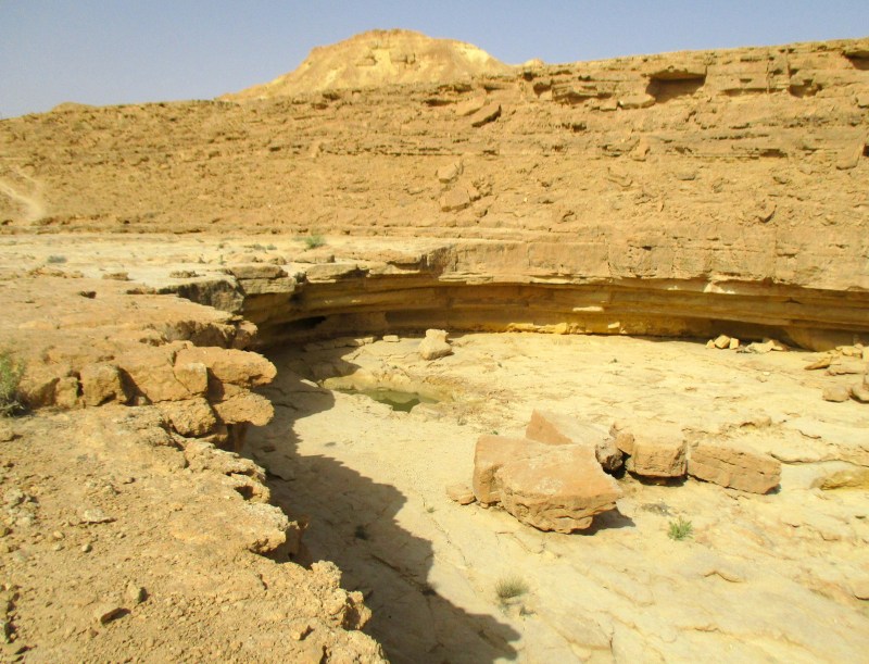 Посетить его, однако, стоило. Гев хоть и маленький, но глубокий и держит воду несколько месяцев после шитафона. Эдакая каменная ванна посреди пустыни, наполненная чистой и приятной водой, расположенная под подковообразным водопадом. Пейзаж вокруг очень живописный, так и приглашает задержаться здесь и посидеть на камнях в тени под водопадом. Хорошо, что гев находится рядом с шоссе, можно наведываться сюда по пути в Эйлат.