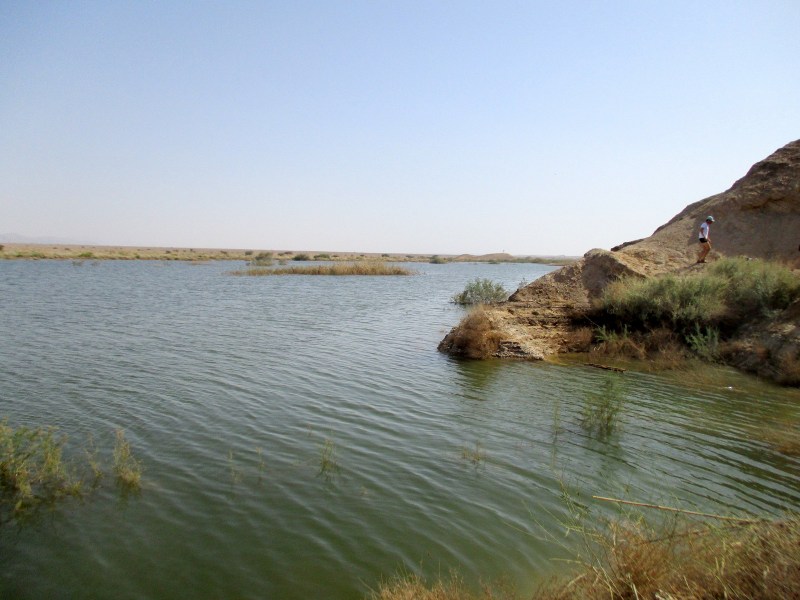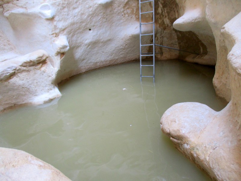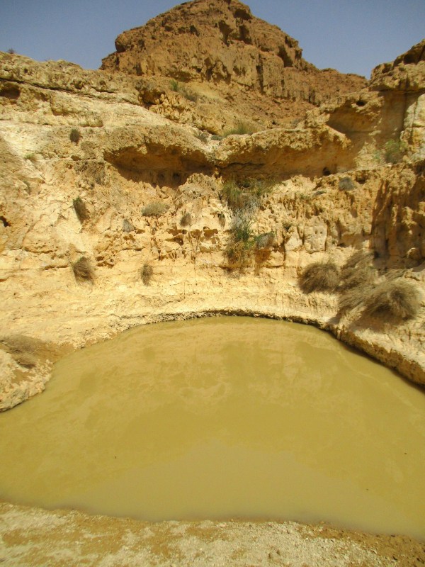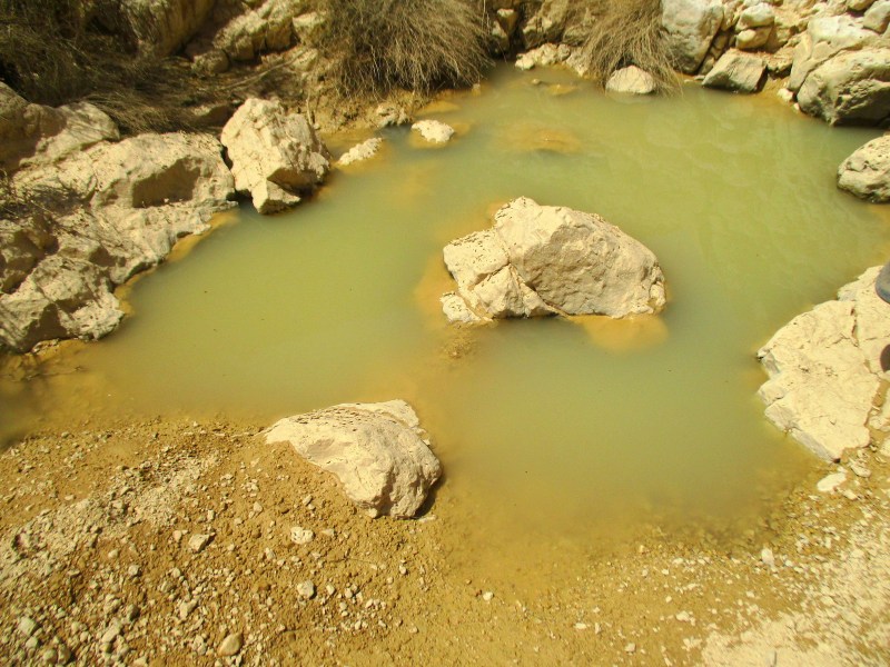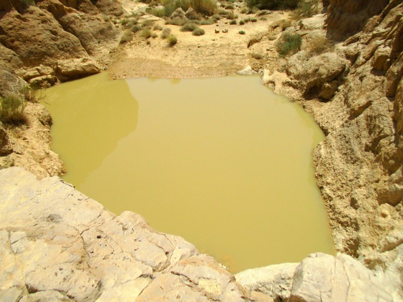 Гев Хадав держит воду недолго — всего две недели после шитафона. Дно его песчанно-глинистое, поэтому он так выглядит: вода мутная, цвета пустыни. Но если бы в нём не плескалось большое количество народа, как это происходит сейчас, гев мог бы выглядеть так: