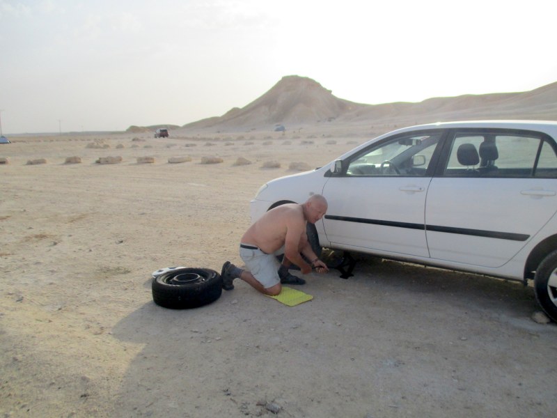 Когда вещи были уложены в машину, и мы уже мысленно были по пути в каньон (очень уж не терпелось увидеть, как он выглядит с водой), Саша обратил внимание, что у машины спушено переднее левое колесо. В принципе то, что колесо приспущено, мы заметили ещё вечером. Но подумали, что это нам только кажется. На ощупь оно было твёрдым. А утром уже сомнений не возникло — у нас есть панчер 😦