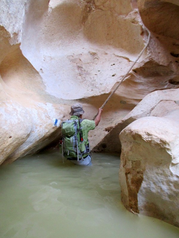 Но вот мы и внутри каньона. В начале было несколько мелких гевим. Затем гев поглубже и подъём по пологому водопаду с помощью верёвки. После него — глубокий гев, где нужно плыть. Это был единственный гев, где требовалось проплыть несколько метров. Подъём из глубокого гева по лестнице и сразу — следующий гев. Большой и красивый. Выбираться из него опять нужно по лестнице, и к ней можно подойти вброд. Плыть не требуется.