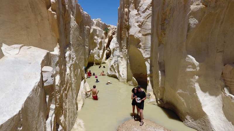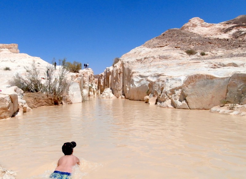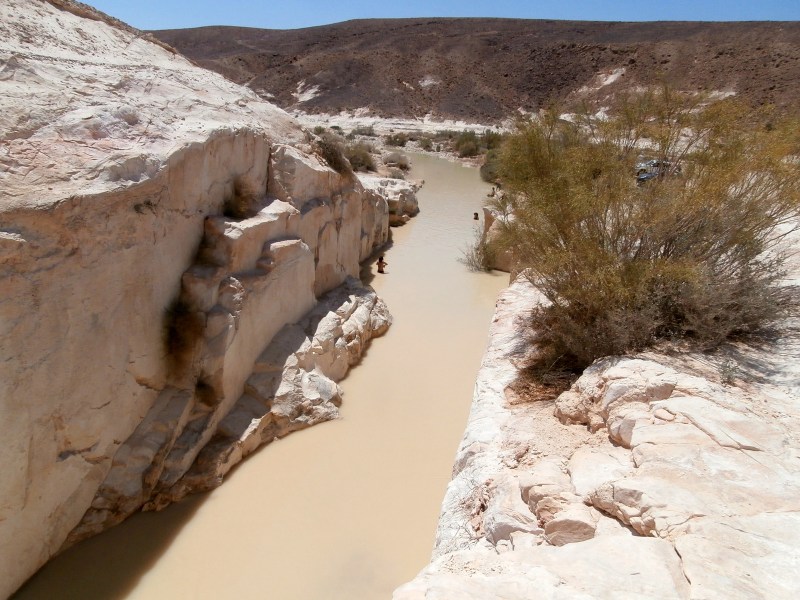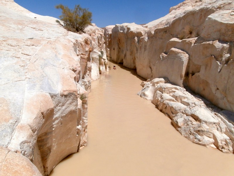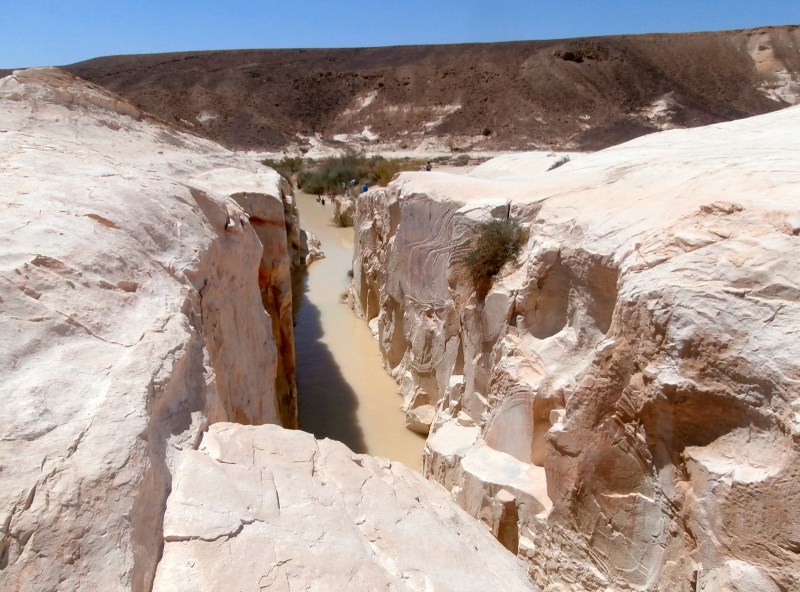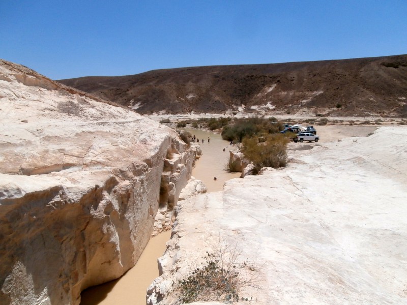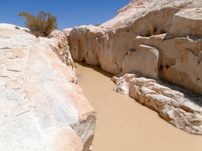 Ну разве это не чудо?! «Течёт» себе нахаль по пустыне, русло его широкое, берега — невысокие. И вдруг на пути русла оказываются белые твёрдые скалы. А вода, как известно, камень точит. И вот мы видим потрясающий результат: Белый Каньон. Да — скромный, да — совсем небольшой и короткий (всего метров 200) и вовсе неглубокий (высота берегов метров 10). Но чертовски красивый. А с водой — вообще сказочный! И всё это среди пустыни!!!