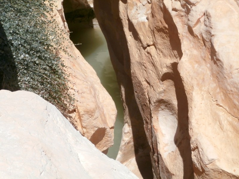 Внутри каньона есть невыcокий водопад. А за водопадом — небывалой красоты прозрачный гев с непотревоженной водой. Не каждому удаётся подняться по водопаду и попасть к геву. Я тоже не смогла, и полюбовалась на прозрачный изумрудный гев лишь сверху.