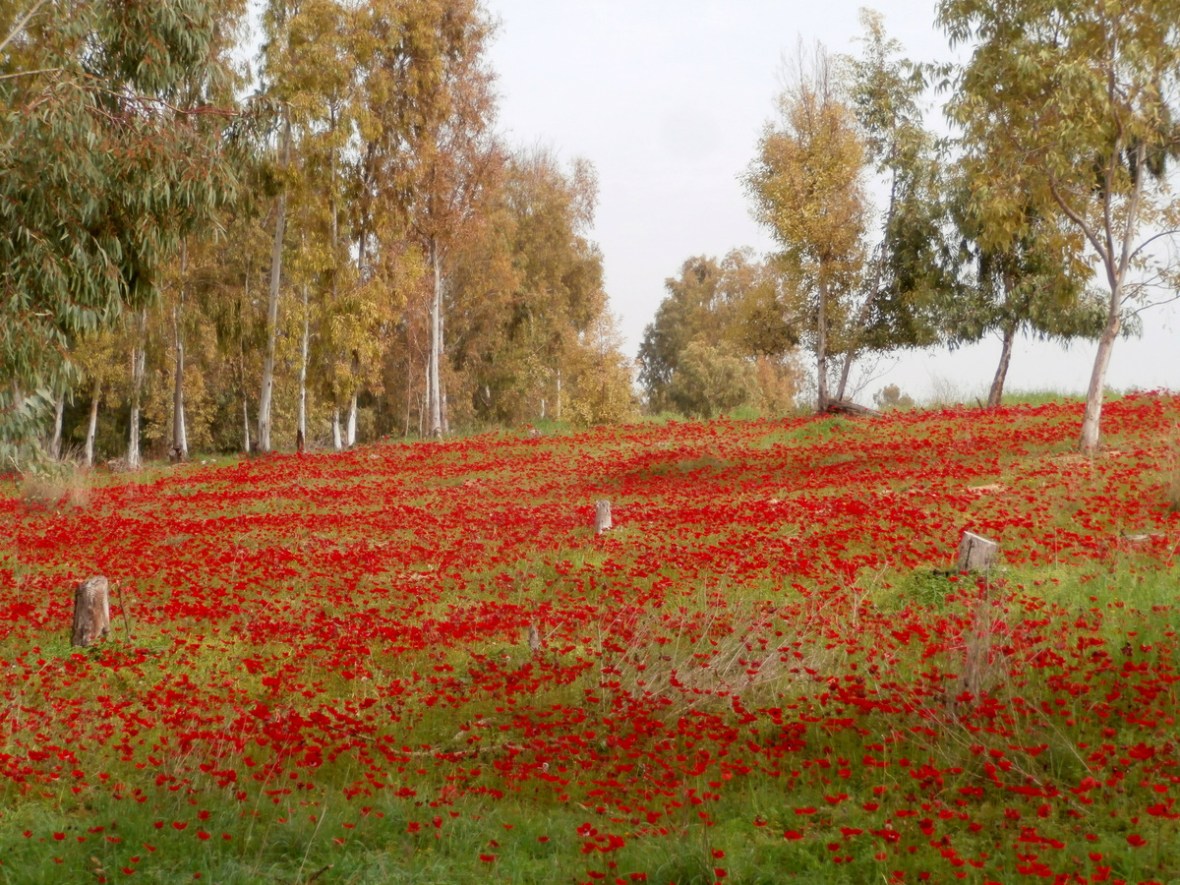 За 26 лет жизни в Израиле, я ни разу не видела красных ковров из цветущих анемонов. Слышала много, но не видела. Полянки цветущих каланиёт тут и там встречала, но чтобы огромные, кажущиеся бесконечными, площади, горящие красным цветом — такого наяву не видела, только на фото.