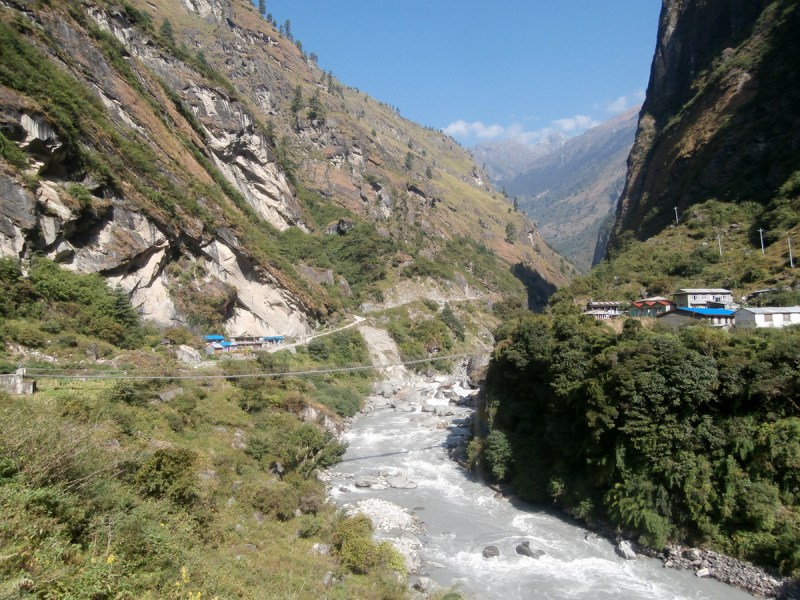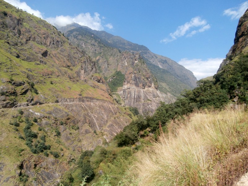 Трек вокруг Аннапурны построен так, что сначала ты идёшь вверх от Бесисахара (820 m) до перевала Торонг-Ла (5416 m), а затем с перевала спускаешься вниз до Наяпула (1070 m). Разумеется, путь к перевалу — это не только вверх, а путь от перевала — не только вниз. На каждом участке есть свои спуски и подъёмы.