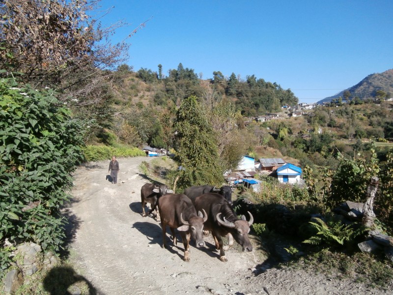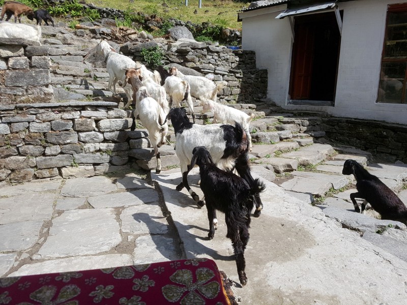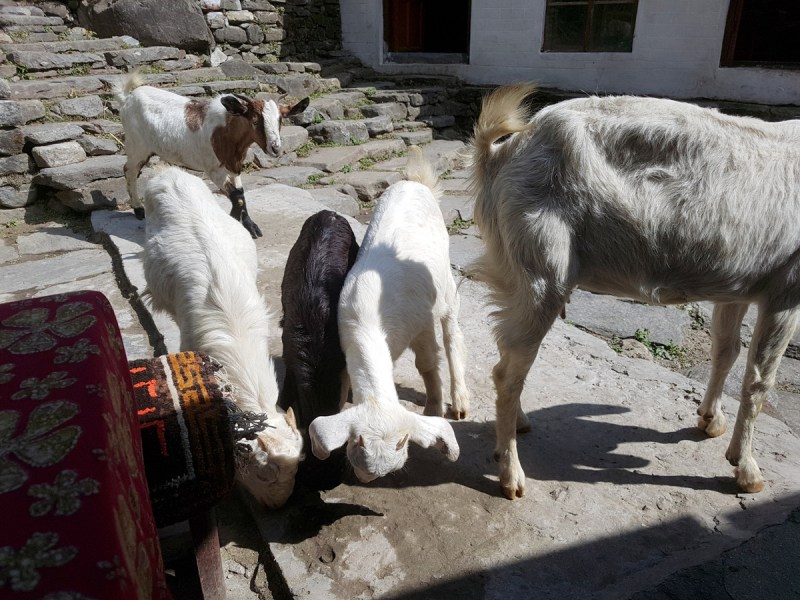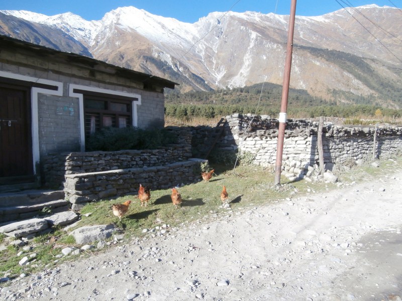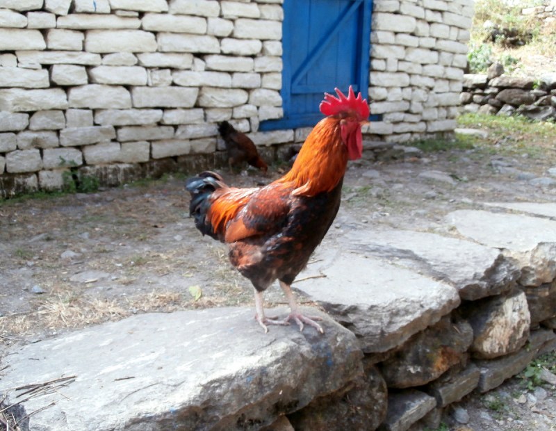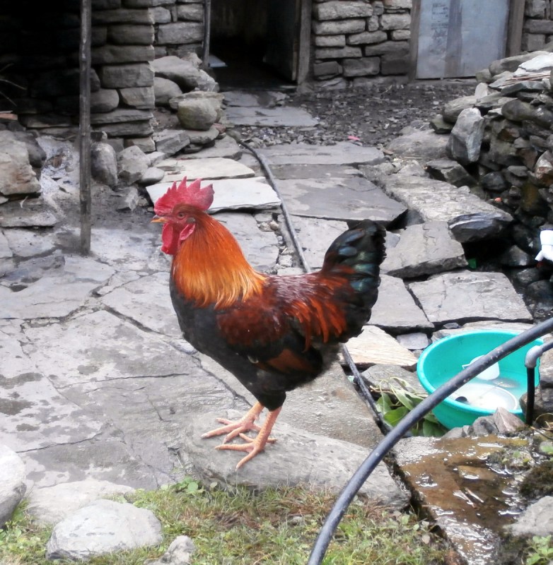Проходили мимо маленьких непальских деревенек, где нет лоджей, где не останавливаются на ночлег туристы. Как сейчас модно говорить — аутеничных. Перед глазами, как в кино, проходила настоящая жизнь простого народа. Это было дико интересно, и я смотрела на всё широко открытыми глазами. Решила делать побольше фотографий. Местные жители, занятые своими делами, животные, гуляющие на воле возле деревень… Всё мне казалось ужасно милым и интересным. Особенно нравились петухи. Они какие-то просто супер красивые здесь, в Непале.