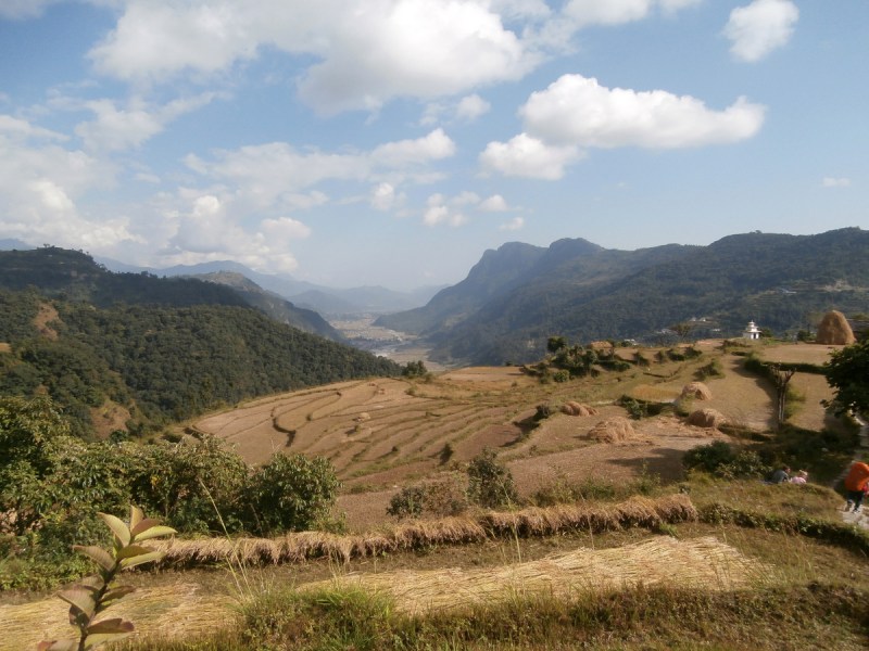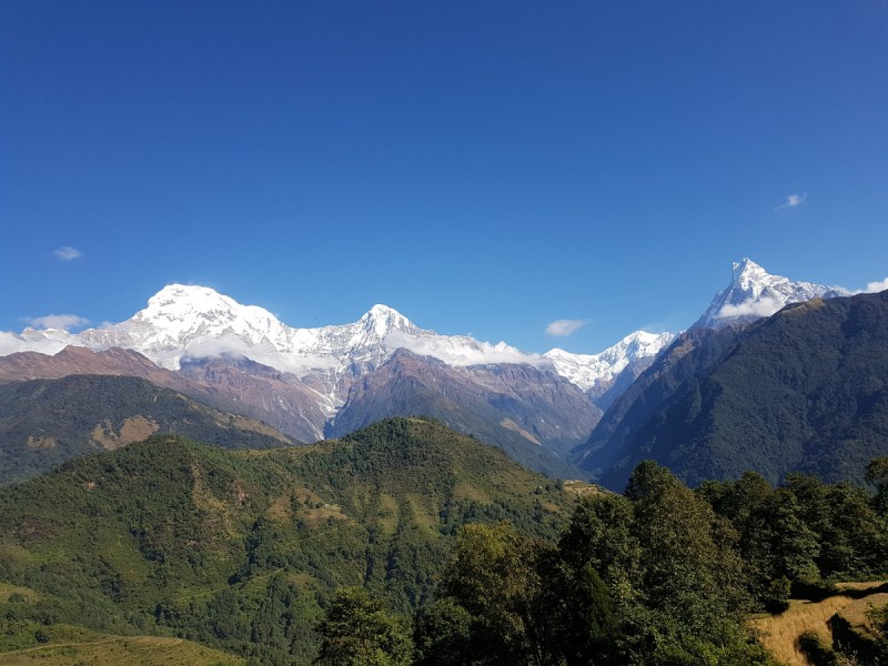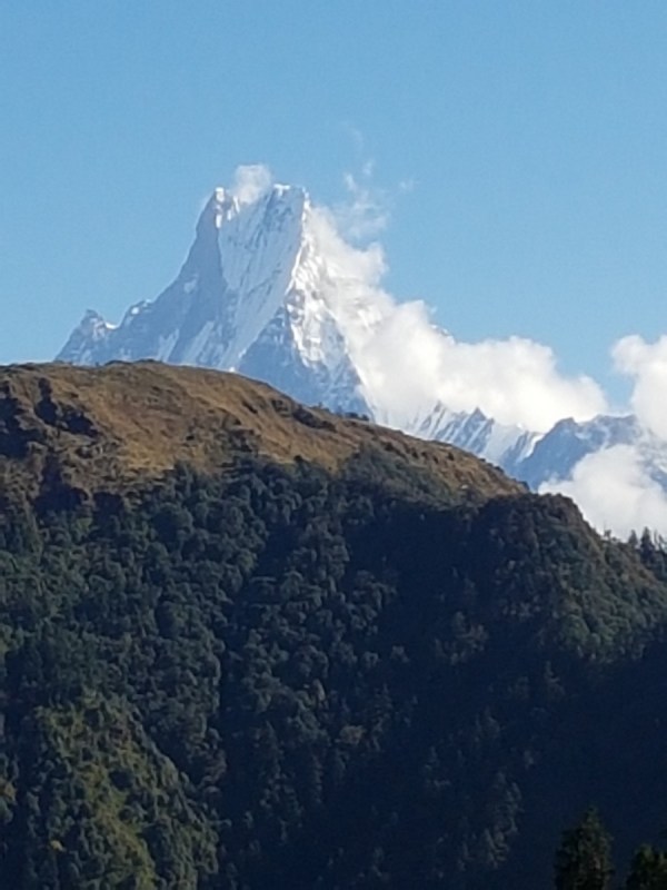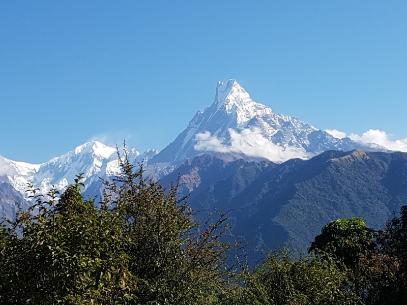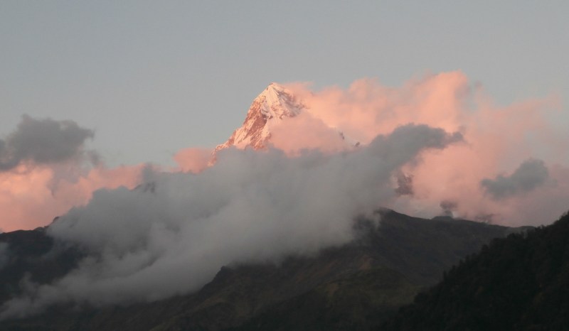 Вид, открывающийся от Ступы Мира. Горы затянуты облаками, и лишь кусочек вершины Мачапучаре виден над ними.