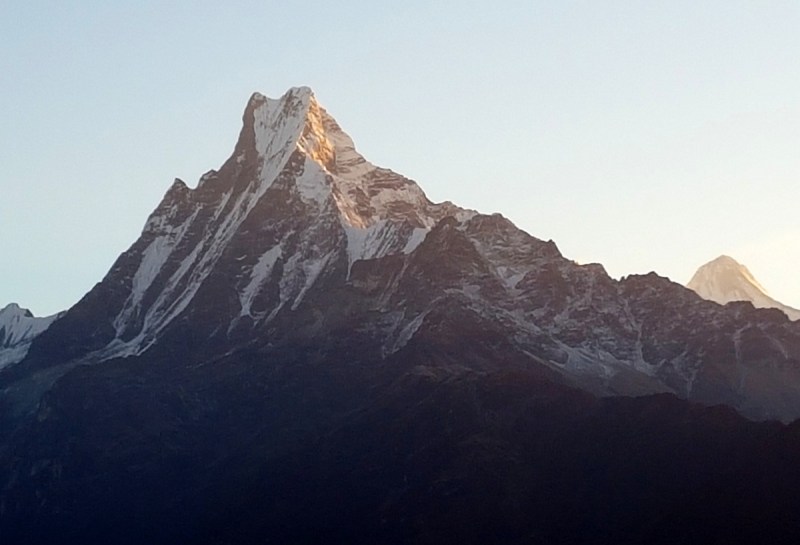 Я отыскала автобус своей компании. Это был 7 часовой, и он вскоре отъехал. На его место прибыл следующий, мой, 8 часовой, до отправления которого был целый час. Я села за столик в кафе и залюбовалась видом на божественную гору Мачапучаре. Утром, пока не набежали облака её вершина было хорошо видна.