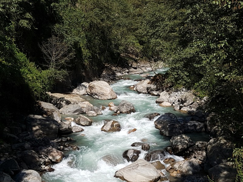 После Гхасы спустились по крутому склону к реке и по мостику перешли на левую сторону ущелья. Река на этом участке уже более полноводная и бурная. Не такая, как возле Джомсома. Хотя там — другая красота, красота, которой нет здесь.