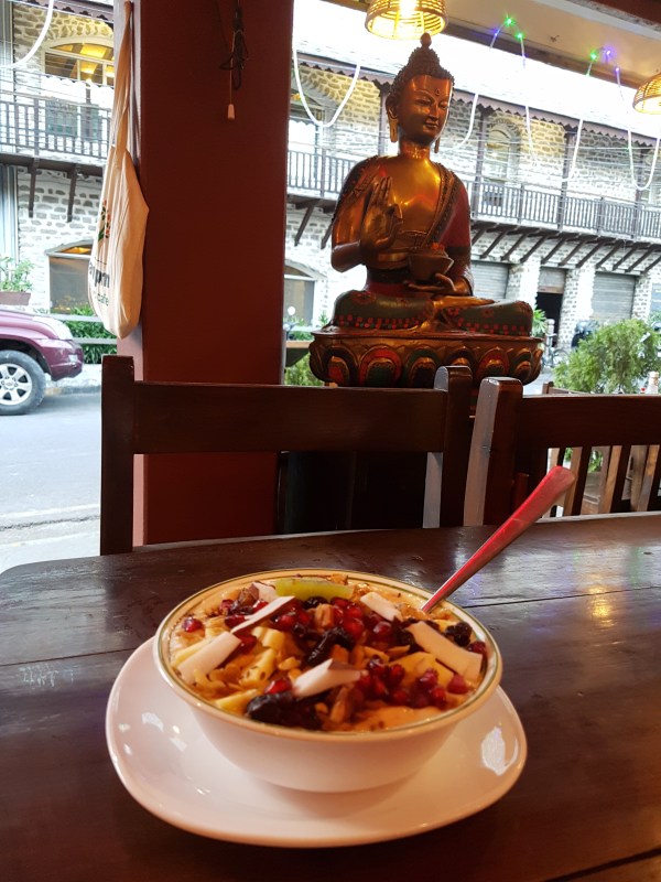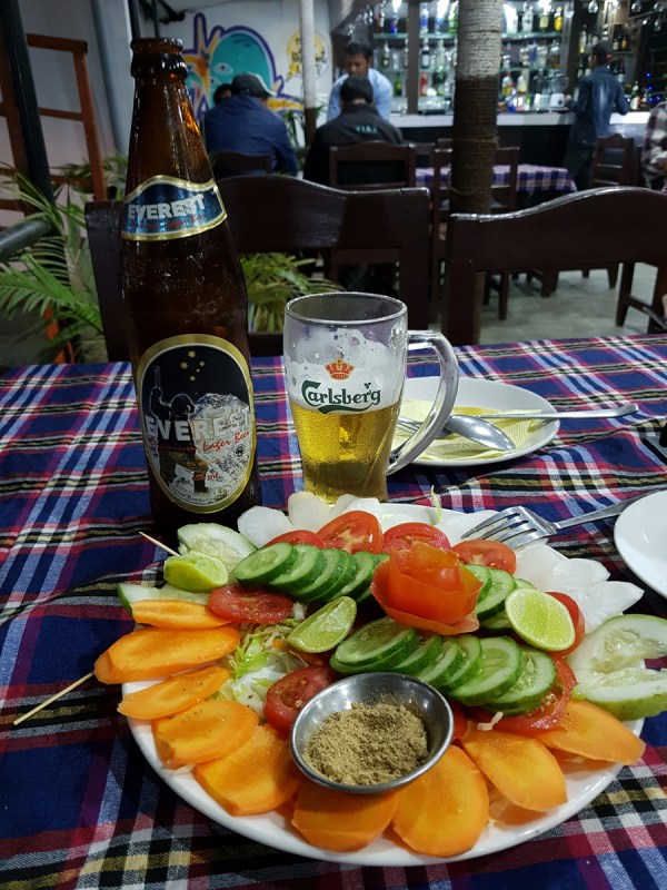 После трудов праведных можно и пообедать. Картофельный супчик — просто супер! И салат из помидоров с фиолетовым луком — когда я последний раз такое ела? Не припомню. Вообще, в Непале хорошо кормят. Еда простая, свежая, вкусная и довольно разнообразная. И всё ещё дешёвая.