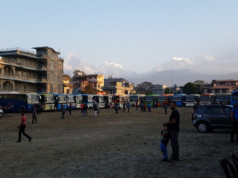 В отличие от Катманду, в Покхаре на автостанции был полный порядок. Автобусы стоят в ряд, и на них написано название фирм, нужно только отыскать свою. Видимо такой порядок здесь потому, что это автостанция предназначена исключительно для поездок в Катманду, и большинство пассажиров — туристы, причем не только европейские, но и непальские.