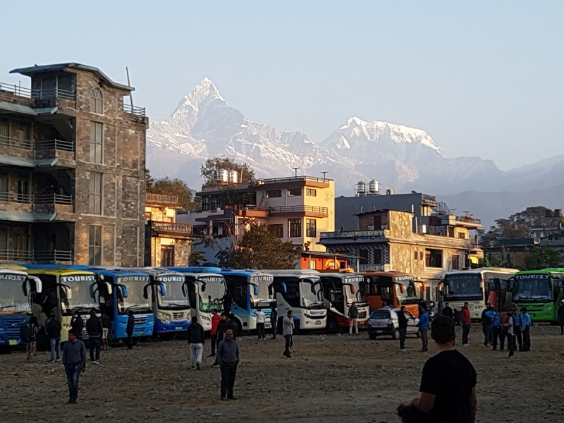 Автовокзал в Покхаре. Автобусы, туристы… И надо всей этой мирской суетой возвышается грандиозная вершина Мачапучаре.